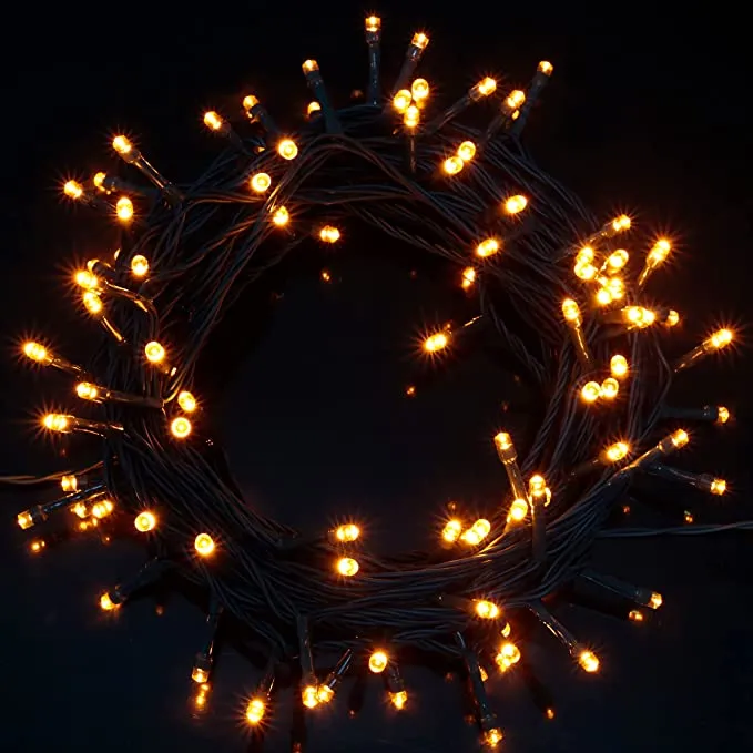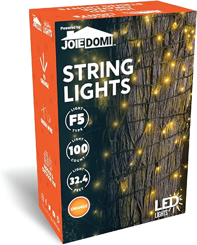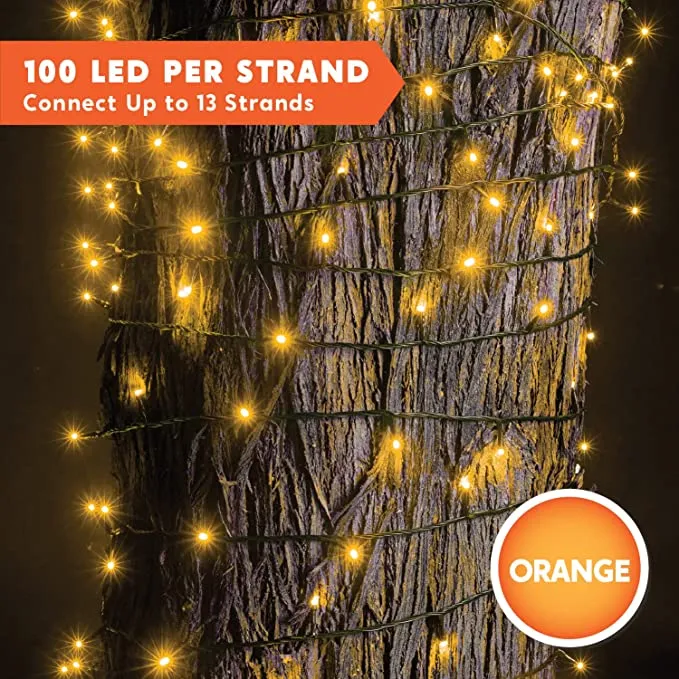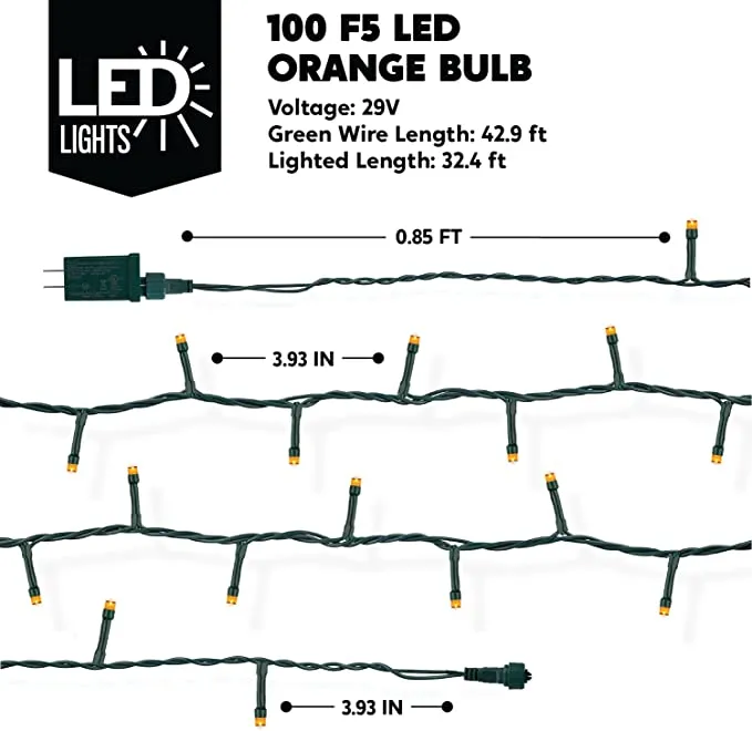 - Our Halloween lights include 100 count orange LED green wire string lights with 8 modes. Each set’s total length is 42.9 feet and it has 3.93 inches spacing. The bulb’s height is 8mm.