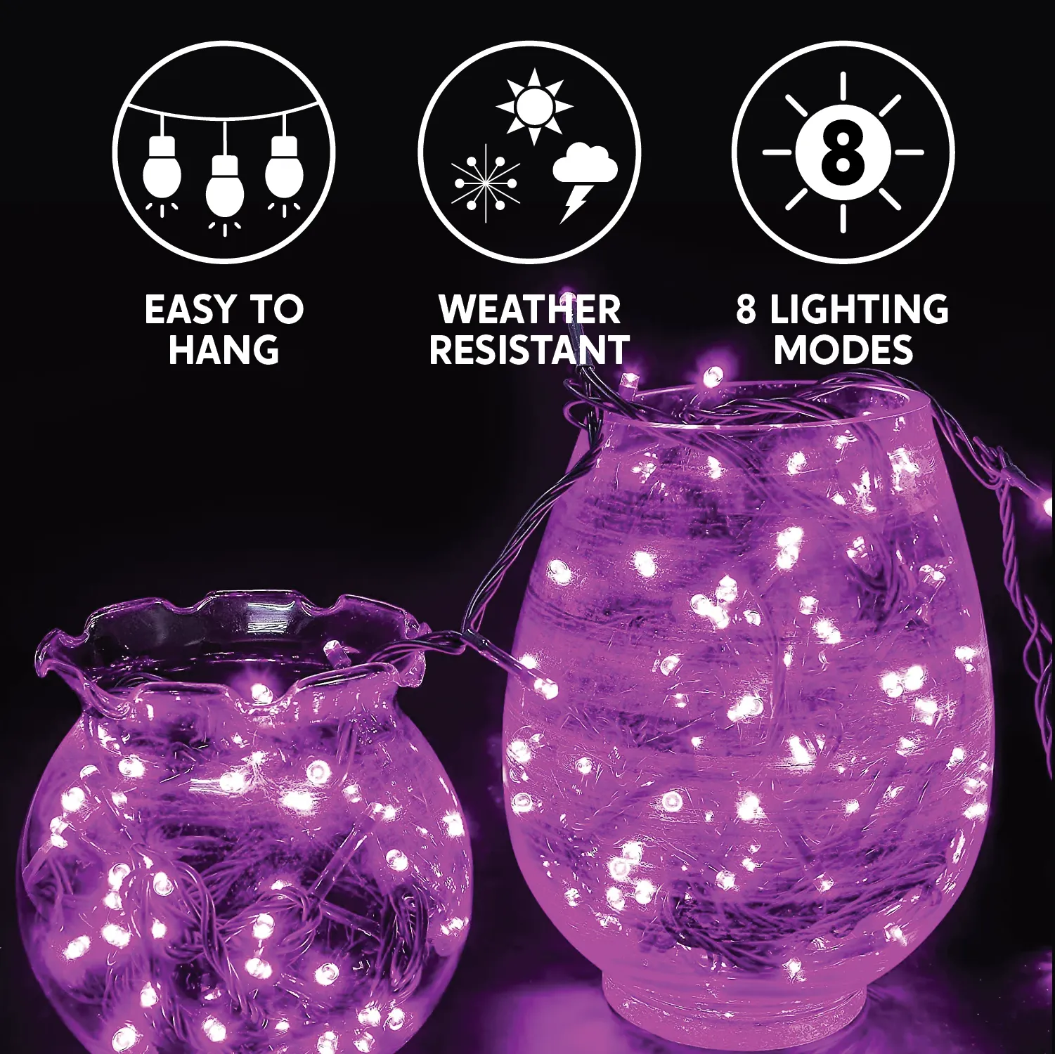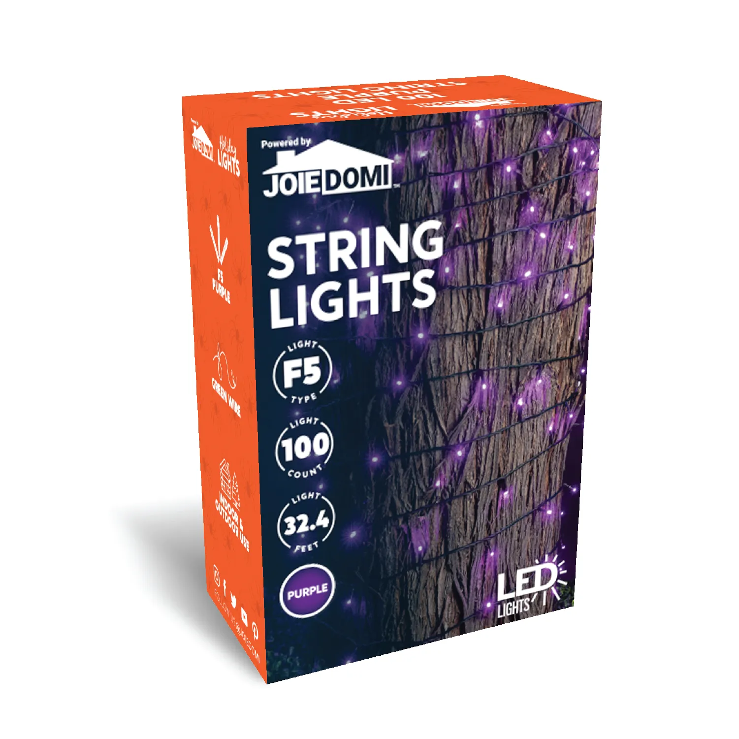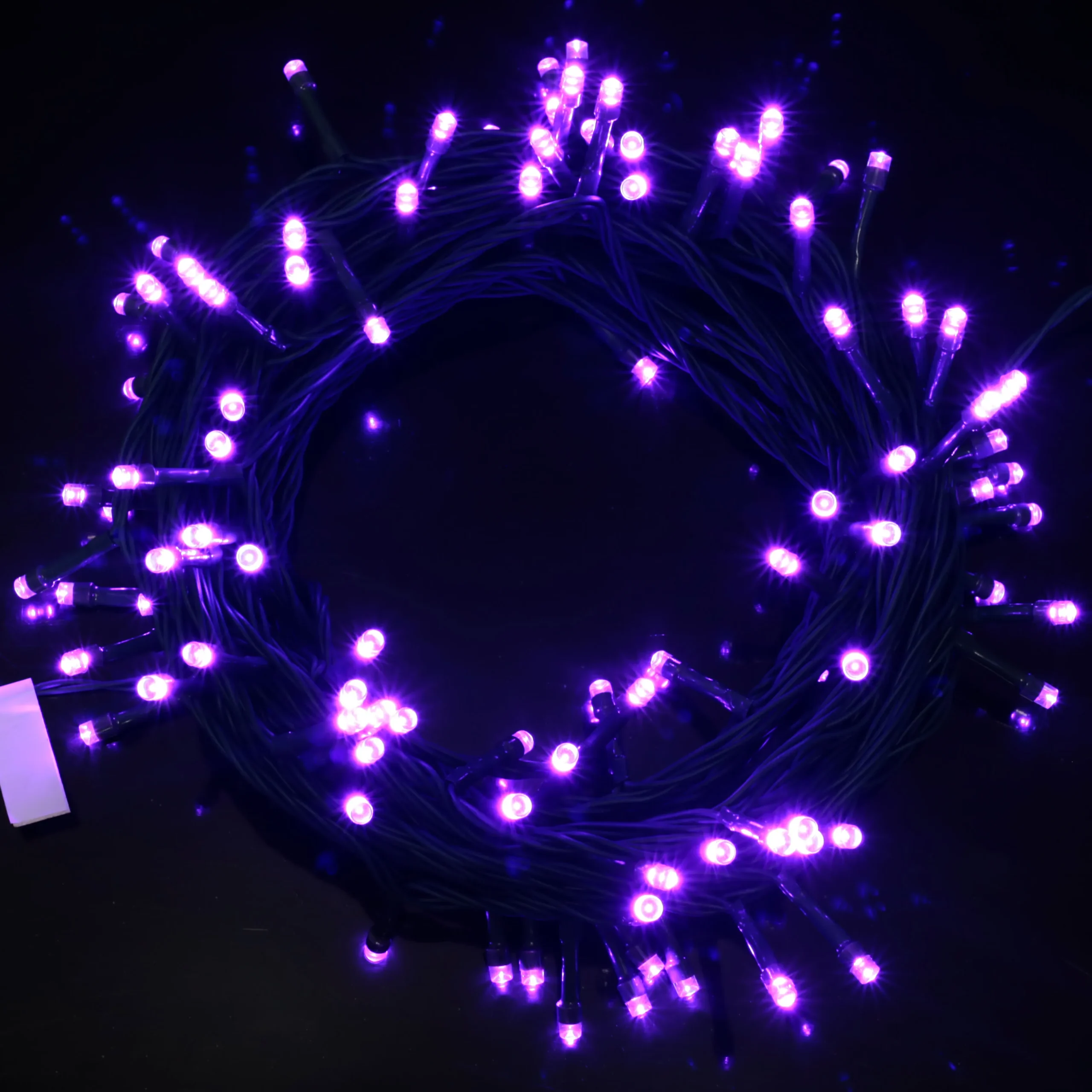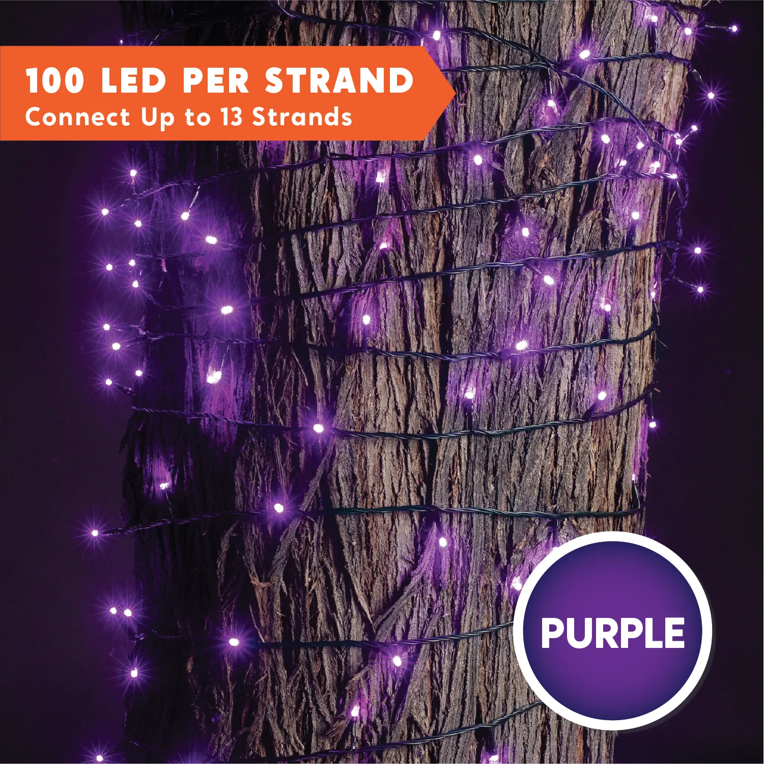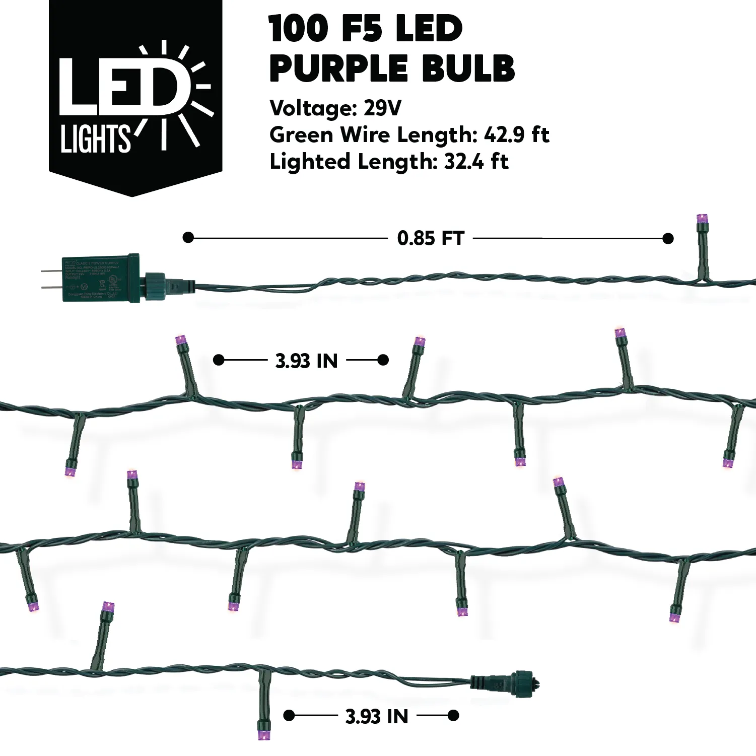 - Our Halloween lights include 100 count purple LED green wire string lights with 8 modes. Each set’s total length is 42.9 feet and it has 3.93 inches spacing. The bulb’s diameter is 5mm and height is 8mm.