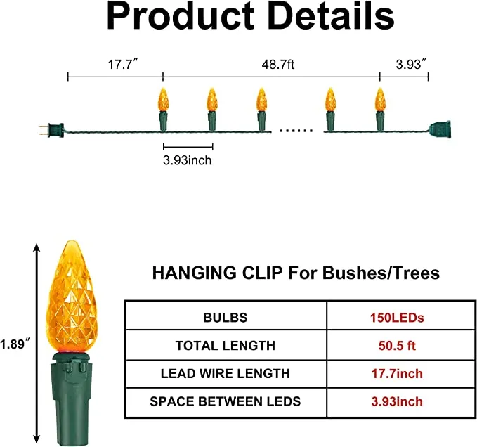- GREAT HALLOWEEN DECORS: Our Halloween Lights include 150 counts of orange LED lights. Each set’s total length is 50.5 feet and it has 3.93 inches spacing. The bulb’s height is 27mm.