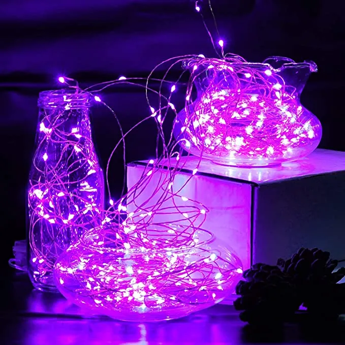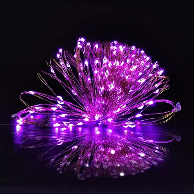 - Our battery-powered purple LED string lights in copper wire with 8 lighting modes measure 66ft. Has a total of 200 count purple light bulbs. Also comes with remote control and battery case.