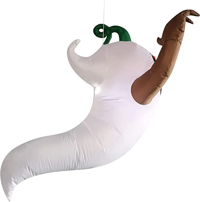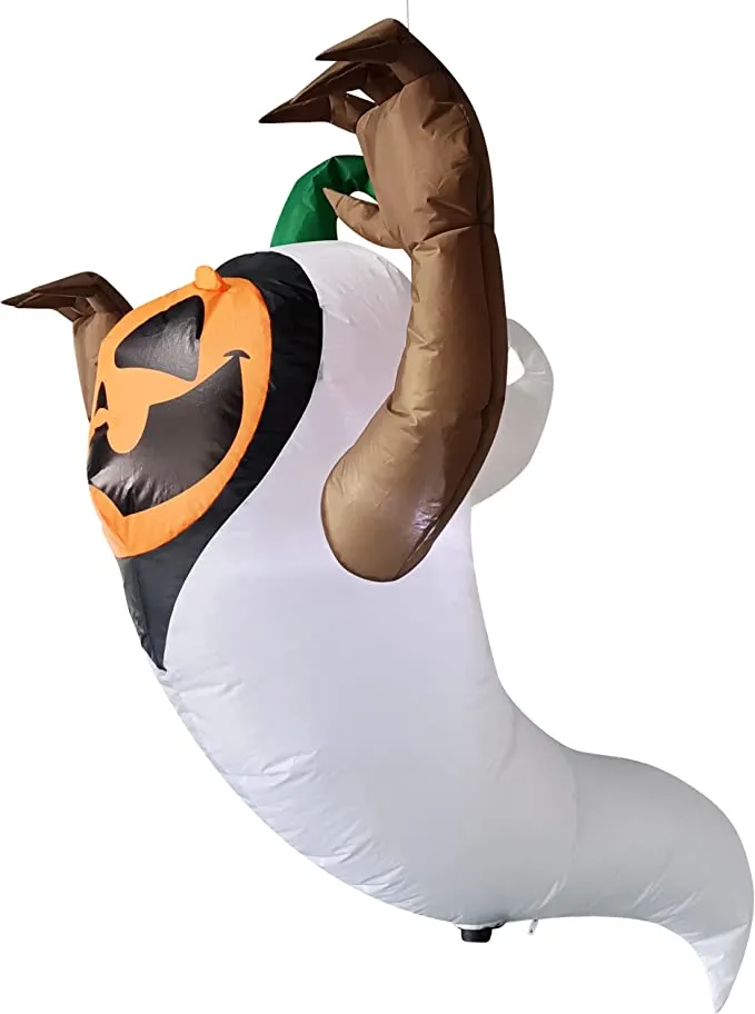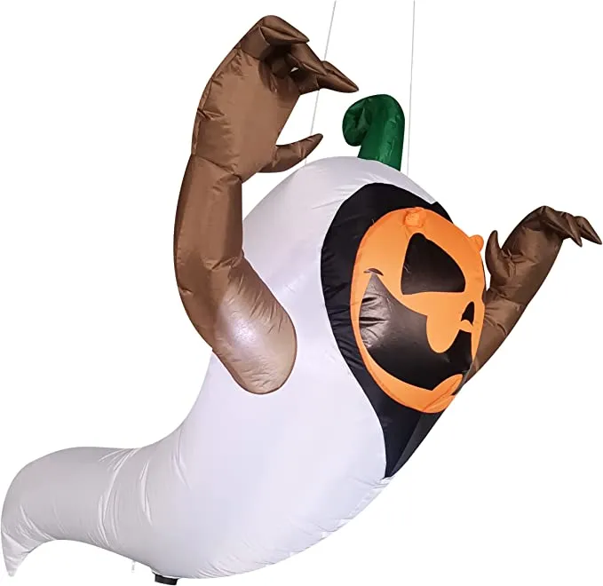 - 4 feet long pumpkin in a ghost costume Halloween inflatable comes with extended cords, ground stakes, fastened ropes, built-in sandbags, and a plug with ul certification.