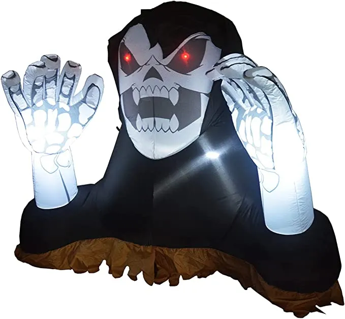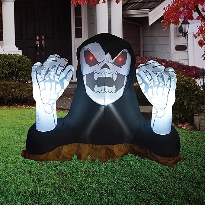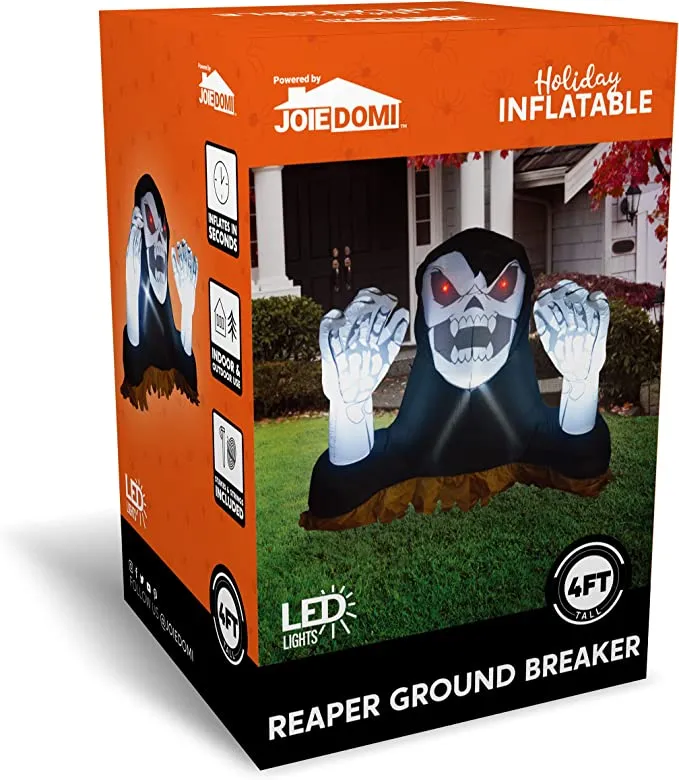 - 4 feet tall reaper ground breaker with hands inflatable comes with extended cords, ground stakes, fastened ropes, built-in sandbags, and a plug with UL certification.