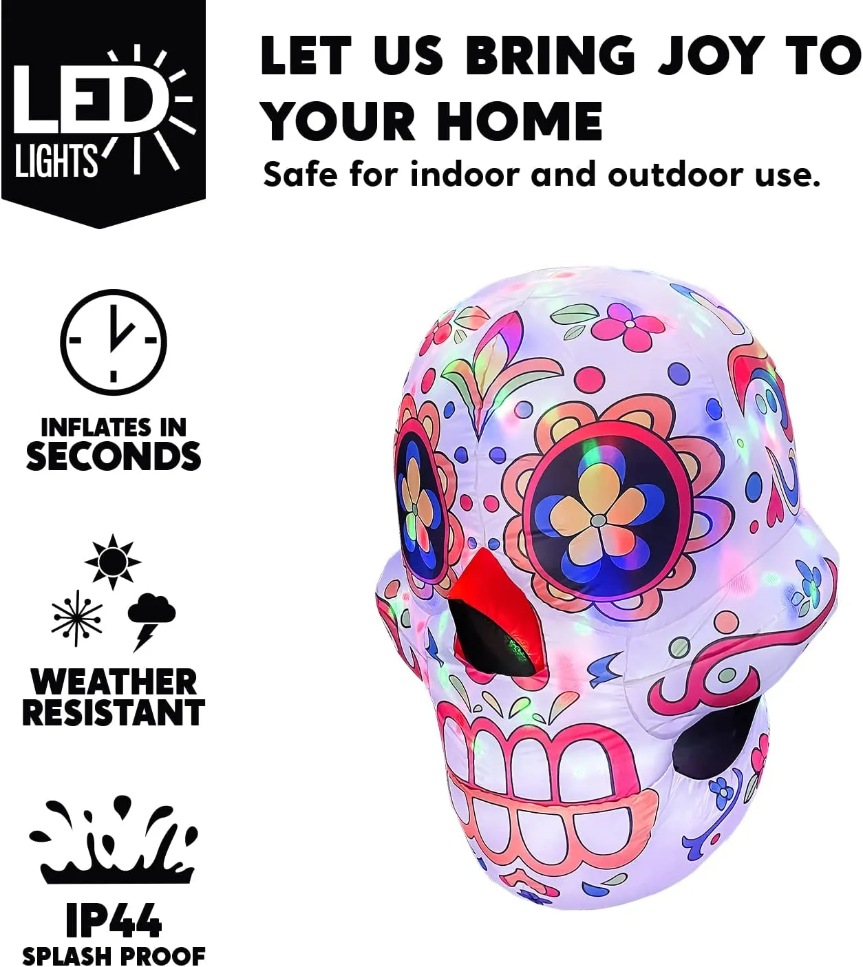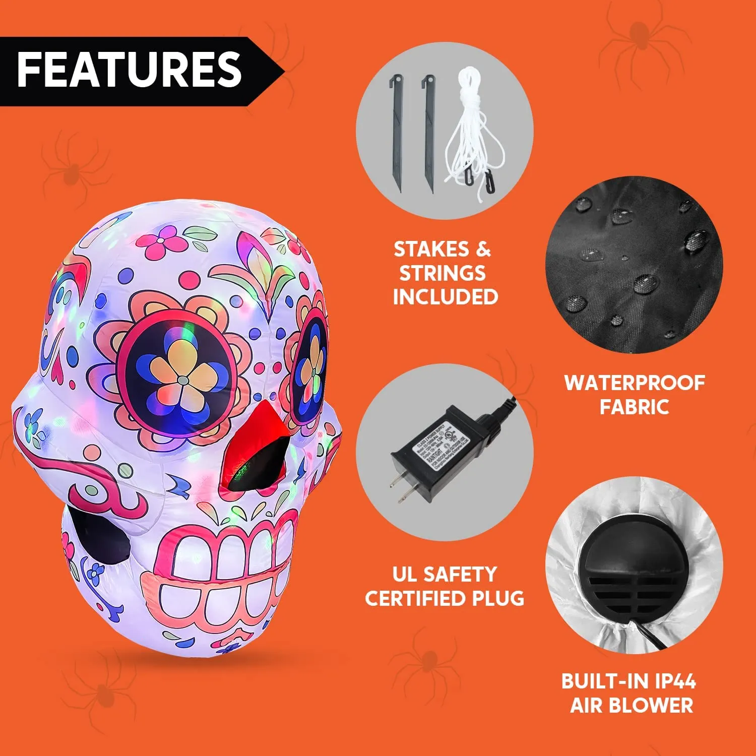 • Inflatable skull comes with extended cords, ground stakes, fastened ropes, built-in sandbags, and a plug with UL certification.