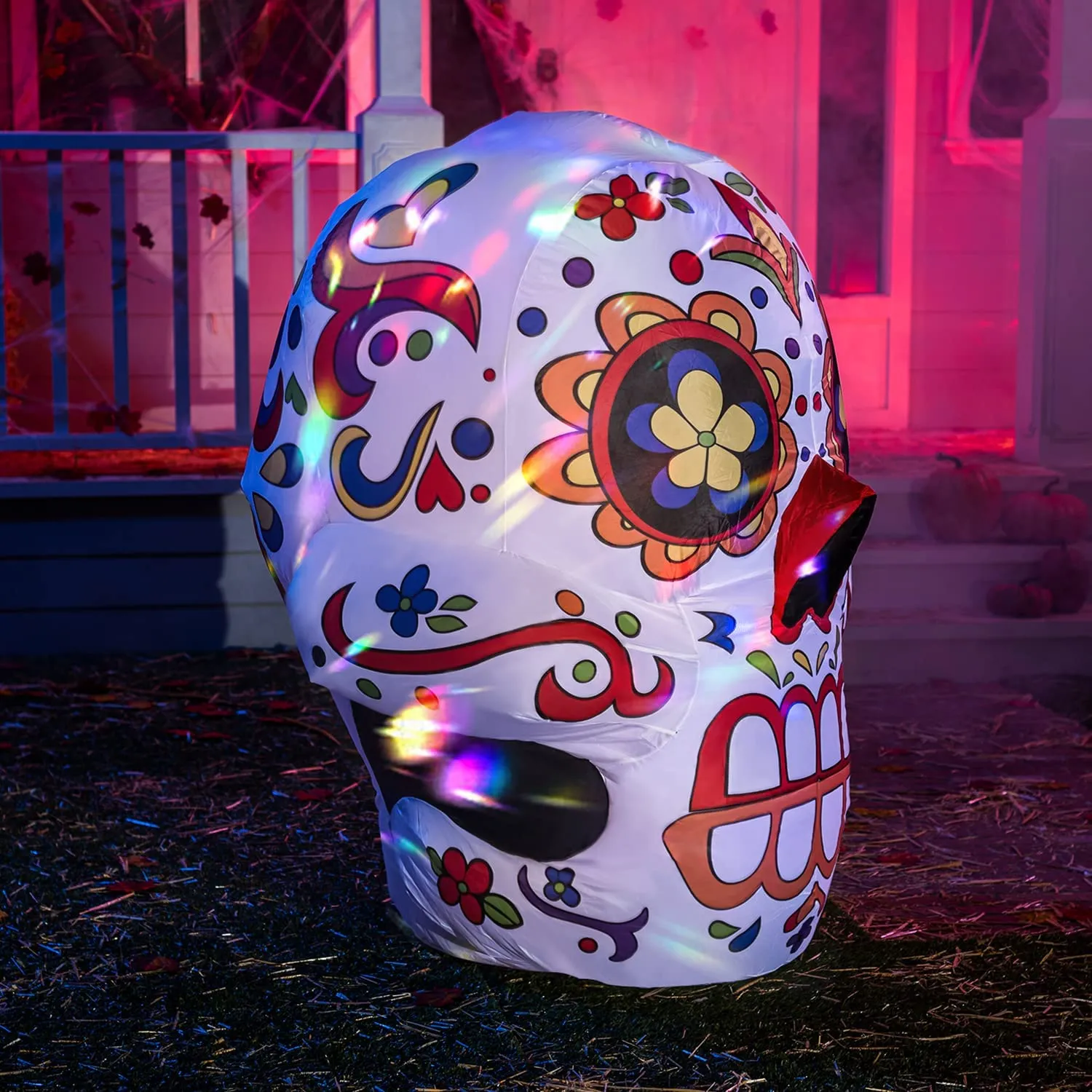 Get your hands on this 4-foot-tall air-blown skull inflatable! It is simple to set up and take down, making this inflatable decoration ideal for both indoor and outdoor use. The fan that is integrated into this yard inflatable handles the labor-intensive work for you and inflates quickly. Using the anchor rope tie-down straps and ground stakes that are included, make sure that this holiday decoration is stable. This substantial lawn decoration is weather-resistant and built to withstand strong winds or heavy downpours. All the ghosts and trick-or-treaters will be attracted by the plush design and vivid colors. This 4-foot-tall air-blown inflatable Halloween skull will brighten your home and neighborhood each Halloween by being displayed in your yard.