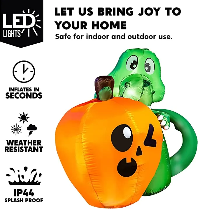 - 6 feet tall dino sitting on pumpkin inflatable comes with an extended cord, ground stakes, fastened ropes, built-in sandbags, and a plug with ul certification.