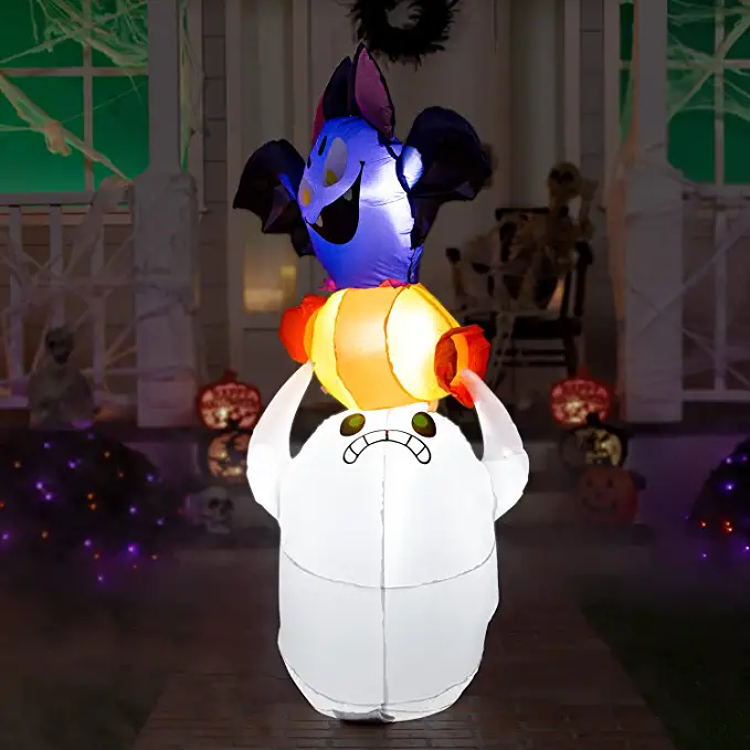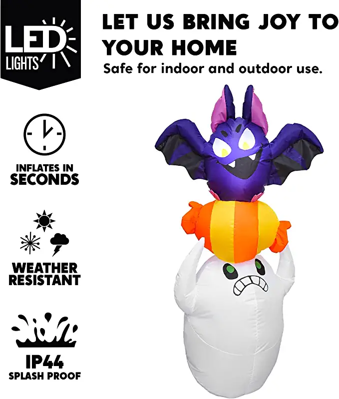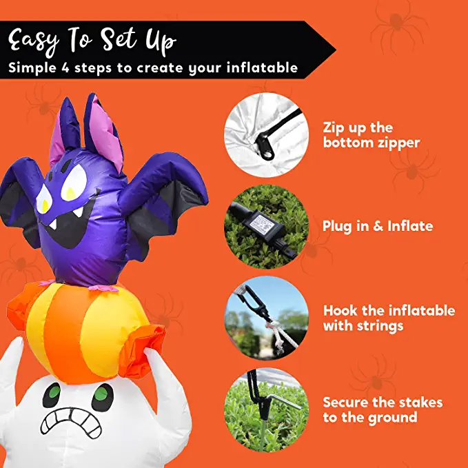 - 5 feet tall Halloween Inflatable Ghost Seize for Candy comes with extended cords, fastened ropes, built-in sandbags, and a plug with UL certification.