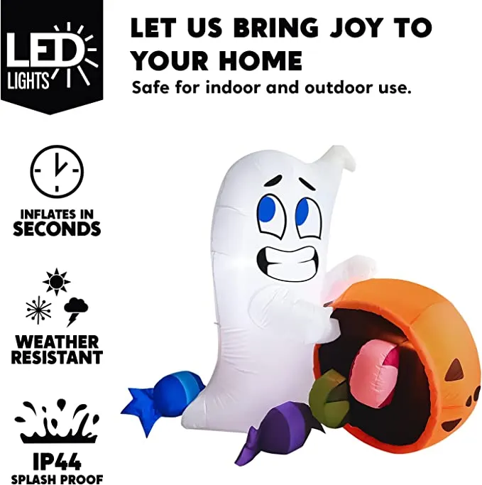 The 5 feet tall cute inflatable ghost pumpkin candy bag comes with extended cords, ground stakes, fastened ropes, and built-in sandbags. This Cute Ghost Dump Pumpkin Candy Bag Inflatable provides a 100% satisfaction experience. The bright built-in LED lights light up in the evening for the best attraction to neighbors and guests. This is a premium quality inflatable Halloween decoration that is very easy and safe for kids to help decorate! Plug it in, and everything appears instantly! This is a large size 5ft tall Cute Ghost Dump Pumpkin Candy Bag Inflatable that comes with extended cords, ground stakes, fastened ropes, built-in sandbags, and a plug with UL certification. Bright built-in LED lights. Plug it in, and everything appears instantly!