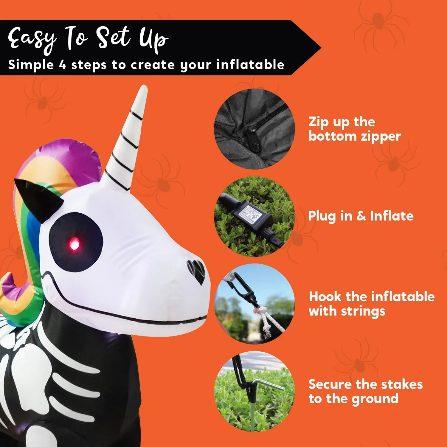 • Unicorn Skeleton Inflatable comes with extended cords, ground stakes, fastened ropes, built-in sandbags, and a plug with UL certification.