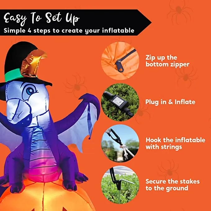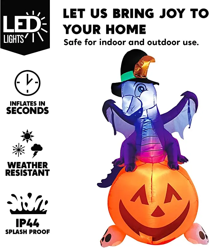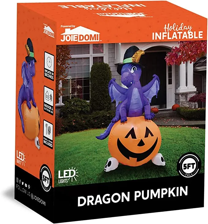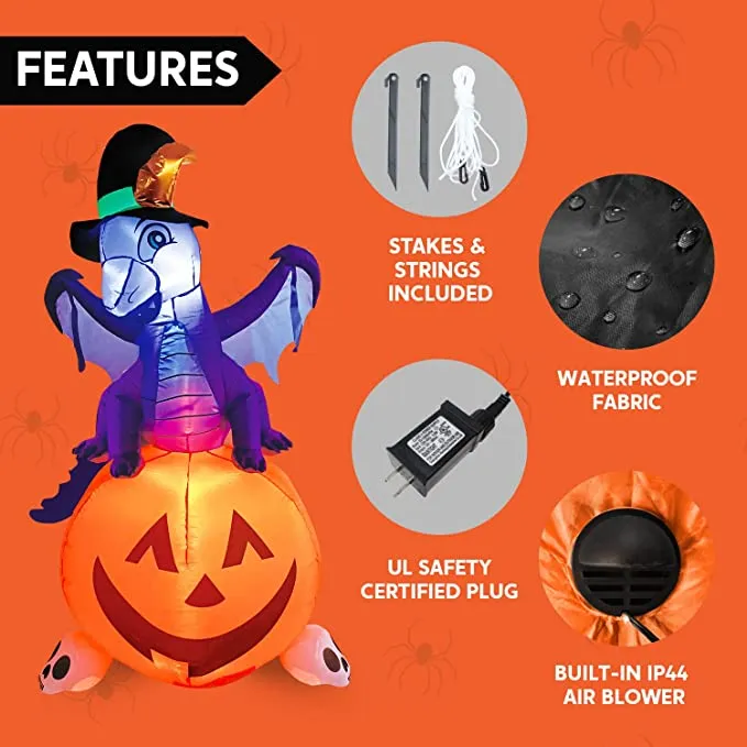 - 5 feet Tall Dragon On Pumpkin Inflatable comes with extended cords, ground stakes, fastened ropes, built-in sandbags, and a plug with UL certification.