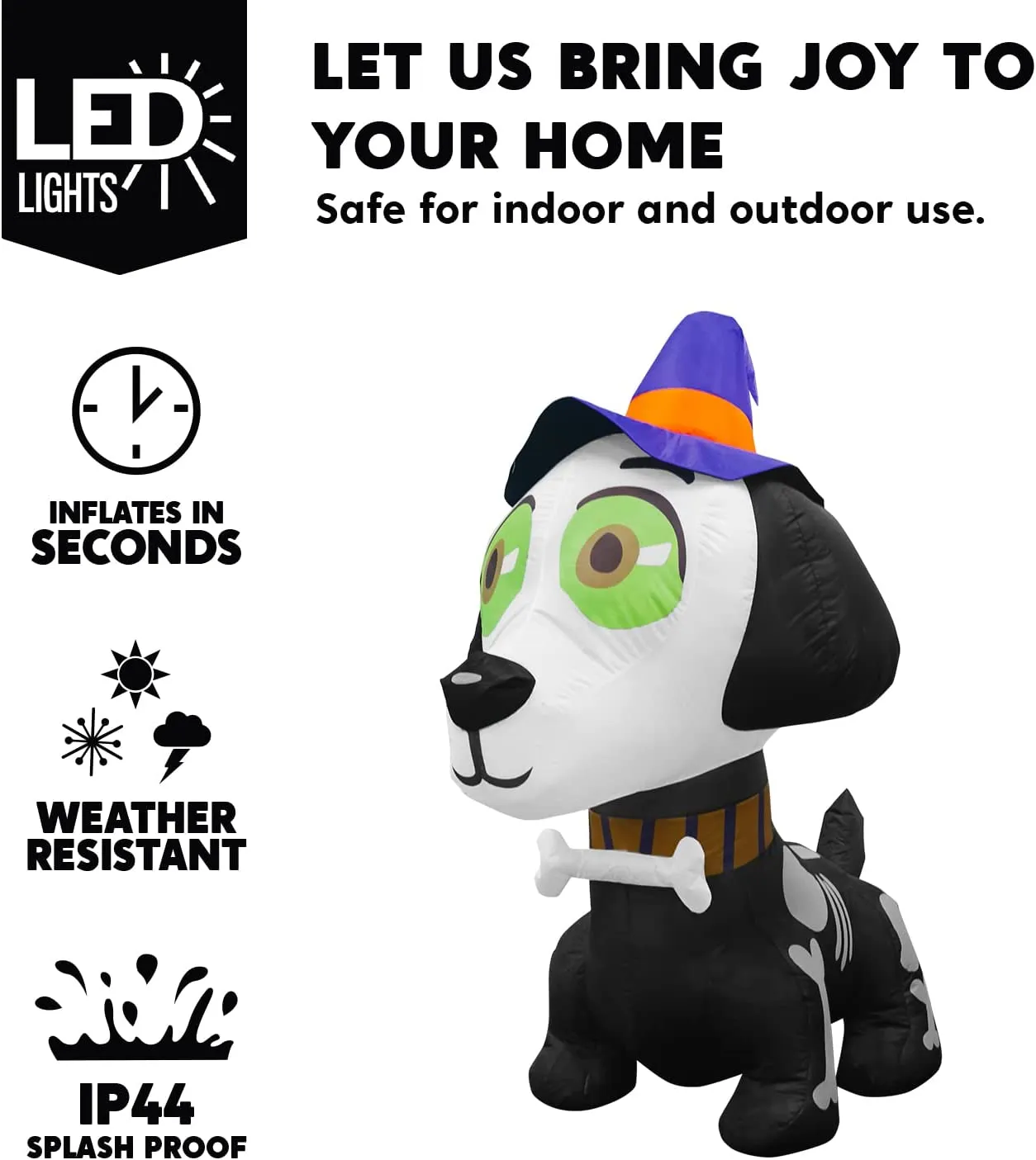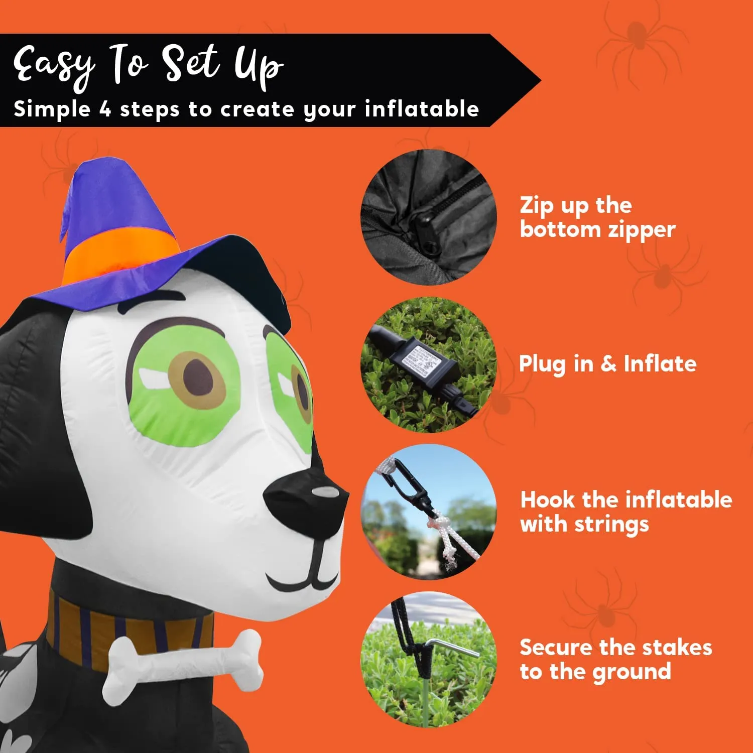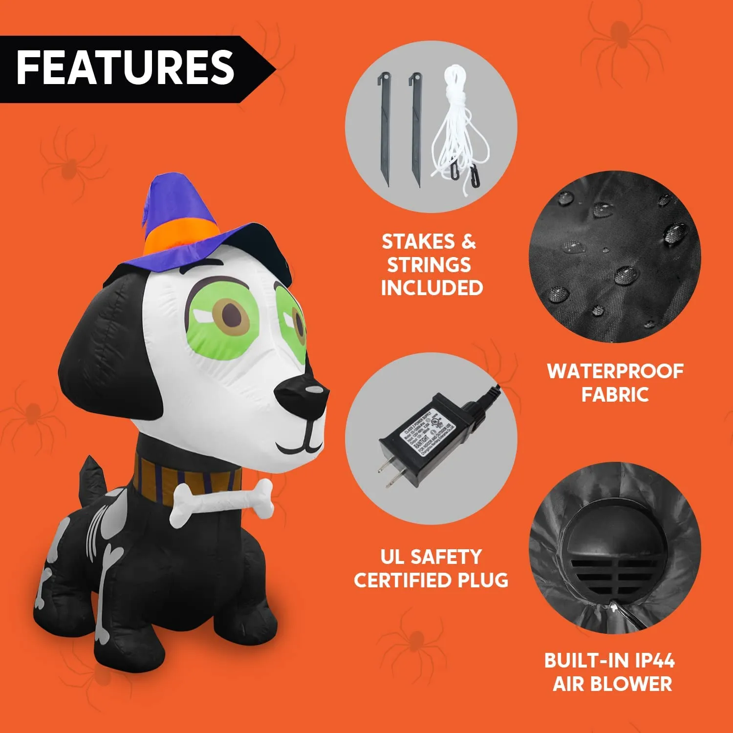 - 5 feet tall witch hat skeleton dog inflatable comes with extended cords, ground stakes, fastened ropes, built-in sandbags, and a plug with UL certification.