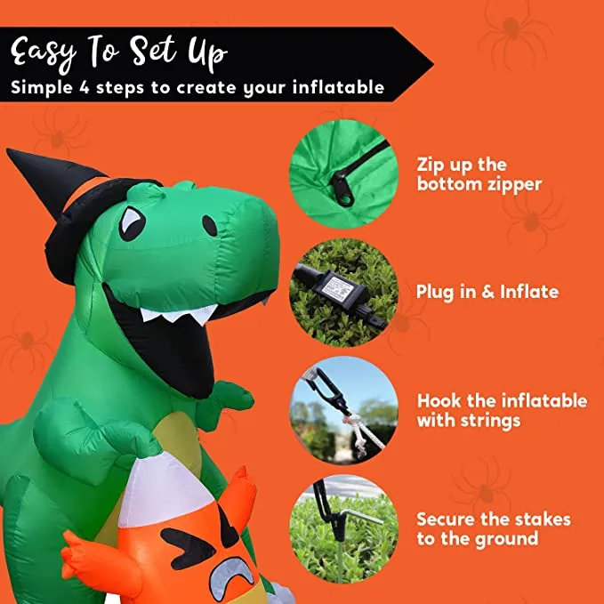 - 6 feet tall dinosaur catching candy corn inflatable comes with an extended cord, ground stakes, fastened ropes, built-in sandbags, and a plug with ul certification.