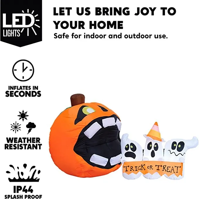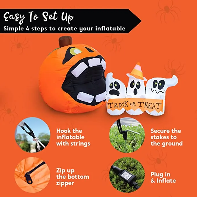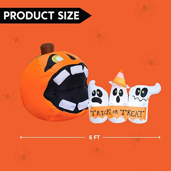 - 6 feet long trick or treat – pumpkin eat ghosts Halloween inflatable comes with extended cords, ground stakes, fastened ropes, built-in sandbags, and a plug with ul certification.