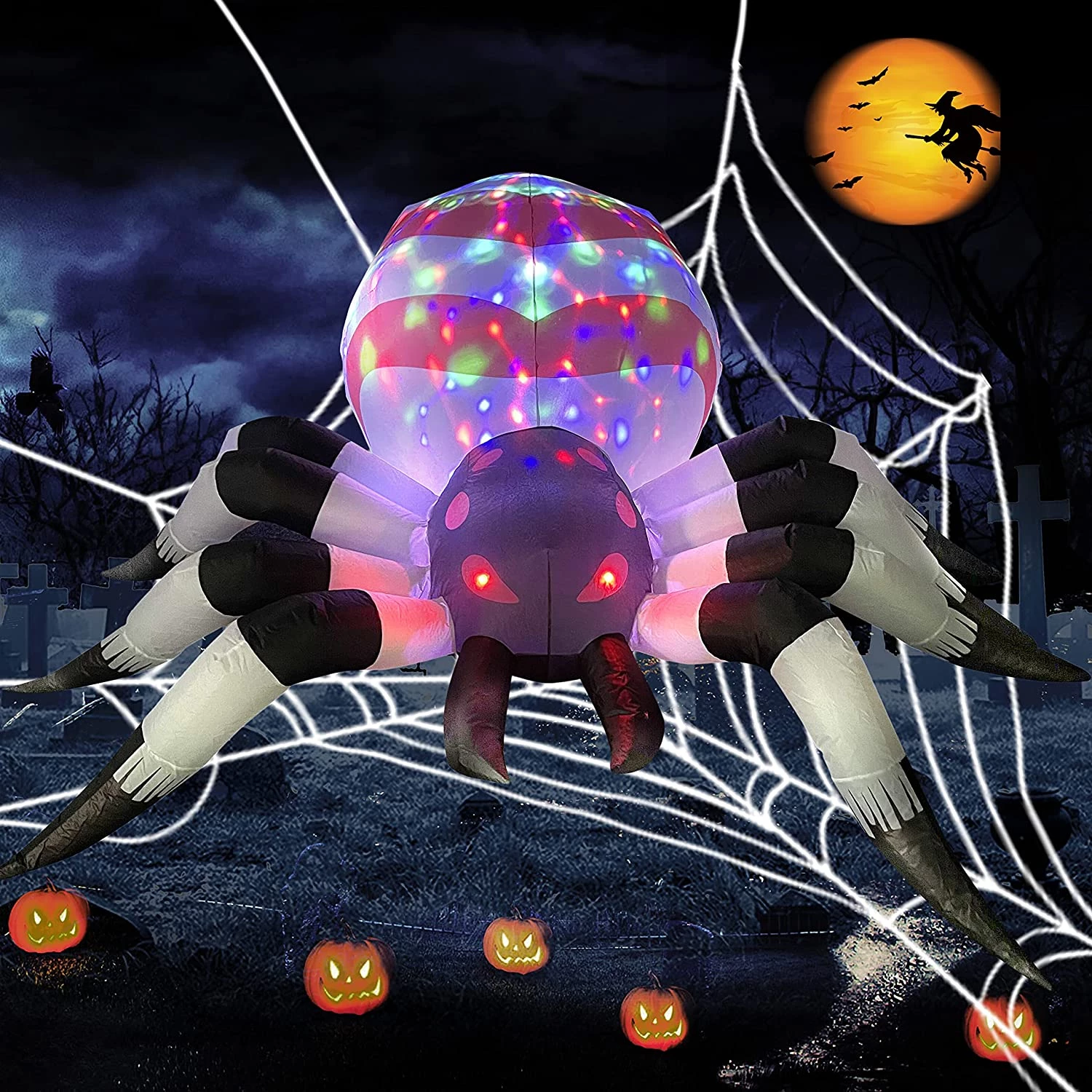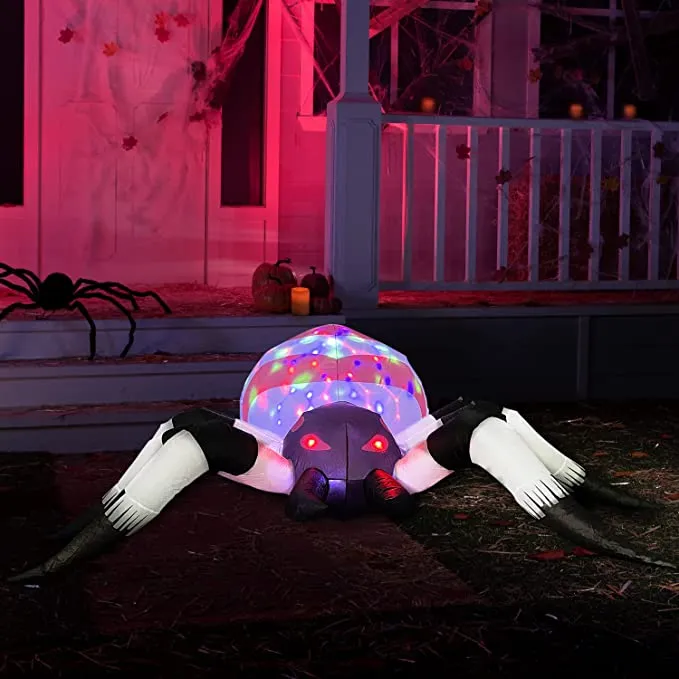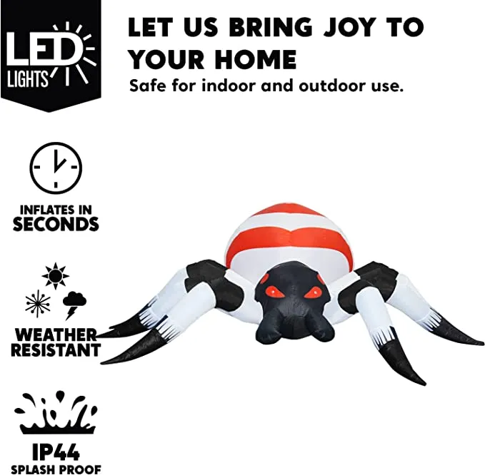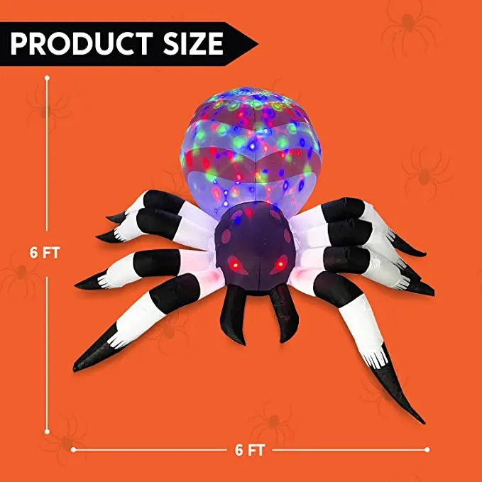 • Halloween Inflatable Spider features a 6 feet long Spooky Spider inflatable designed with LED eyes and colorful projection light. Dump scary giant spider Halloween Inflatable comes with extended cords, ground stakes, fastened ropes, built-in sandbags, and a plug with UL certification.