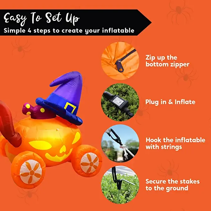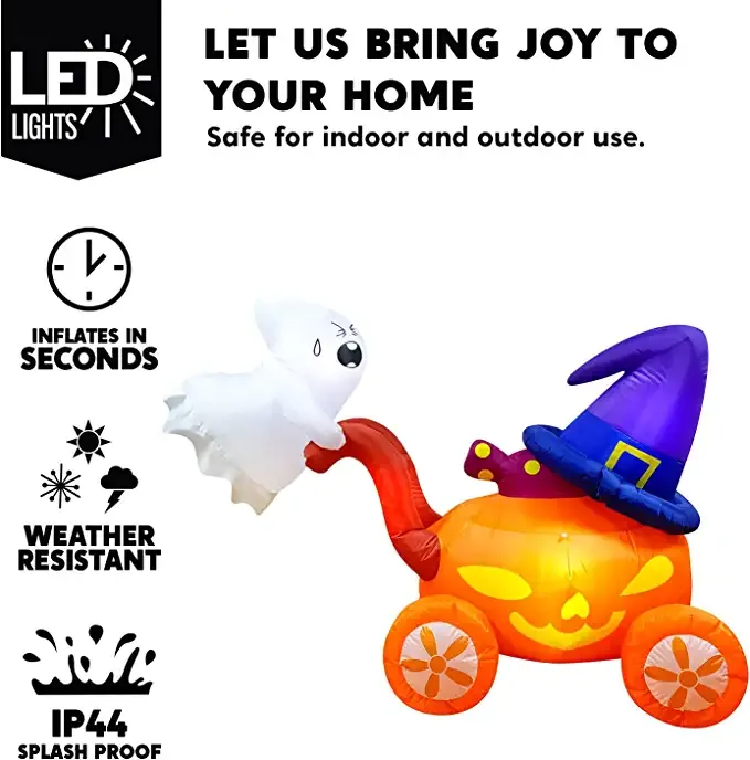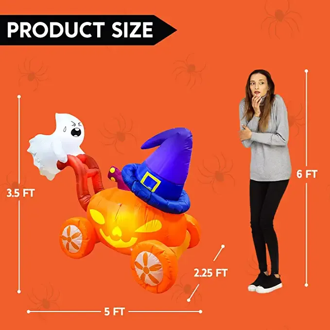- 5 feet tall cute Long Halloween Pumpkin Carriage with Witch Hat with a Hanging Ghost pushes Pumpkin Carriage comes with extended cords, fastened ropes, built-in sandbags, and a plug with UL certification.