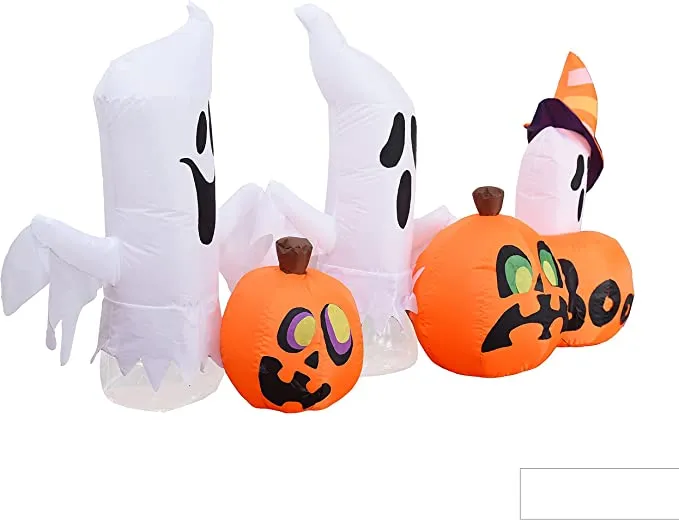 - 7 feet long horizontal ghost with pumpkins inflatable comes with extended cords, ground stakes, fastened ropes, built-in sandbags, and a plug with ul certification.