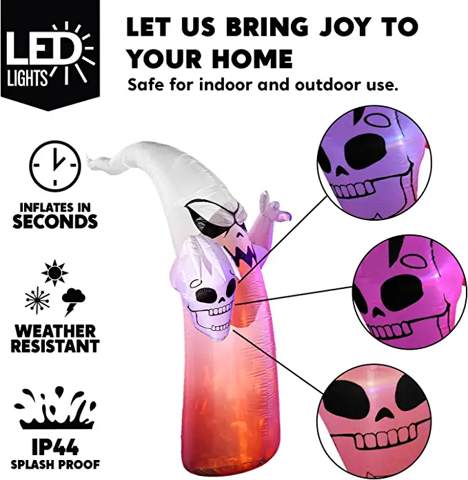 - Bright built-in led lights. Ghost inflatable with red firelight effect and the inflatable skeleton head in its hand can change different colors. Light up in the evening for the best attraction to neighbors and guests.