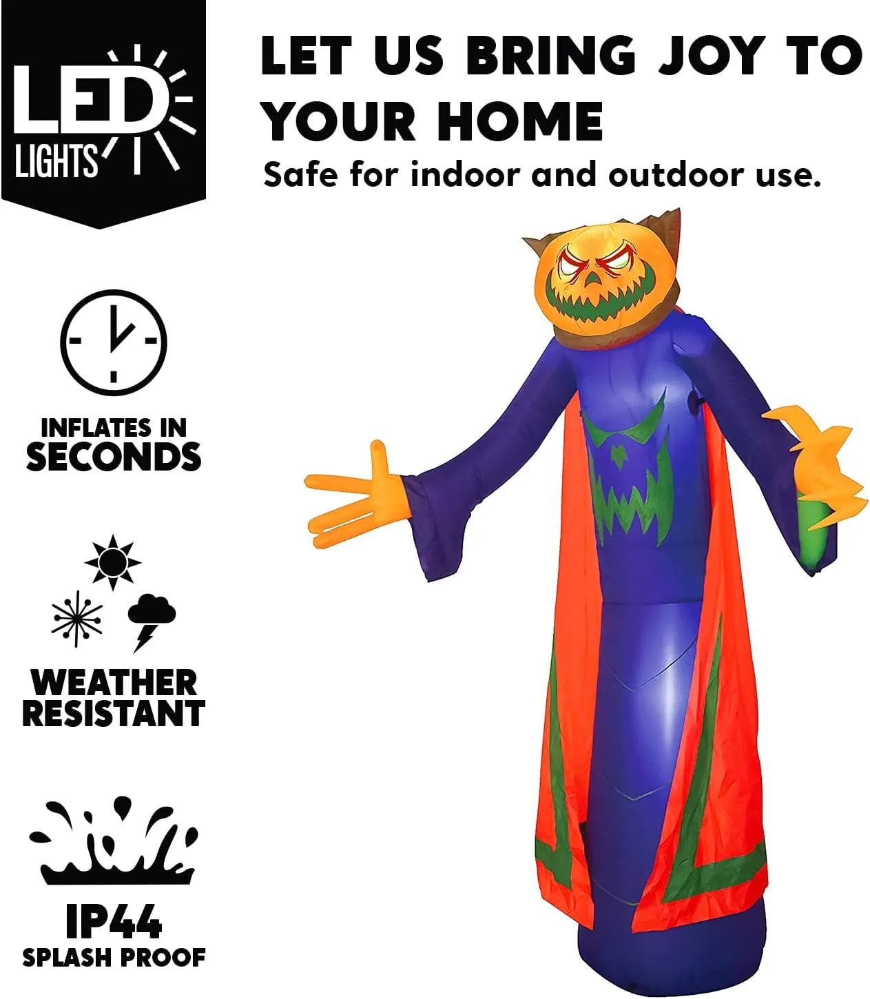 This Halloween inflatable pumpkin is a perfect decor for your parties and other events. Perfect for Halloween decorations and events at night, or used as a yard light in the daytime. Easy to use, lightweight blow-up pumpkin comes with ground stakes and ropes for stability, so you can put it out for your trick-or-treaters and take it down in one minute. This decoration is perfect for the front porch, yard, deck, or patio. Get this ON TIME for Halloween Night! The 8 Foot Tall Inflatable Halloween Pumpkin Wizard blows up to 8 feet high and 12 inches wide. The spookiest Halloween yard decoration! Very easy to get it up and fully inflated. Plug in the unit, and everything pops up in less than a minute!