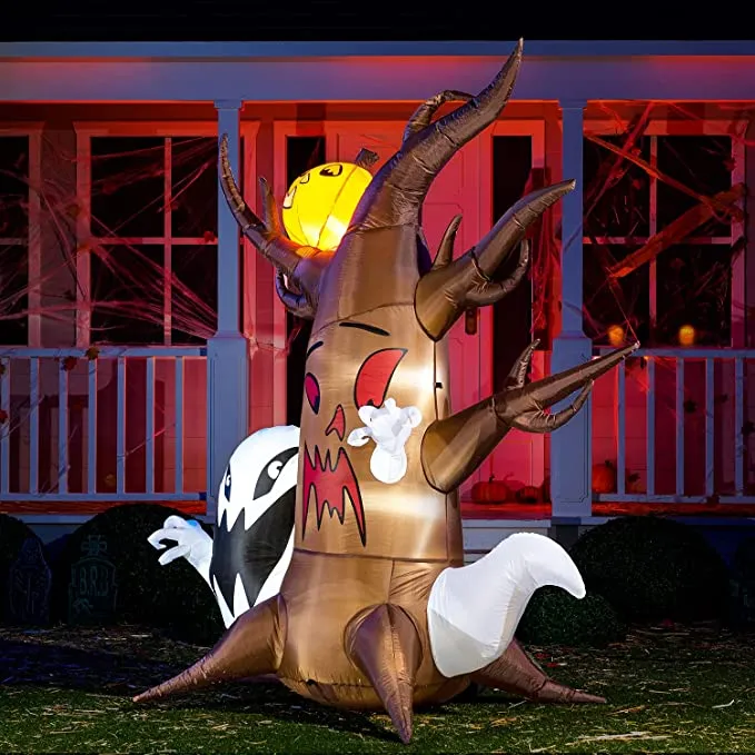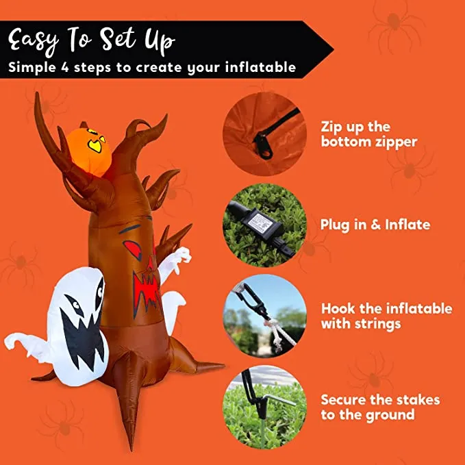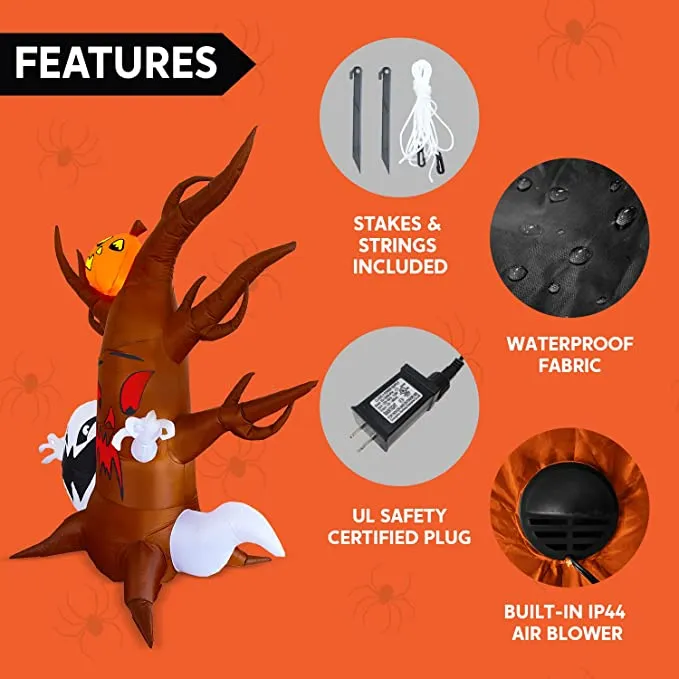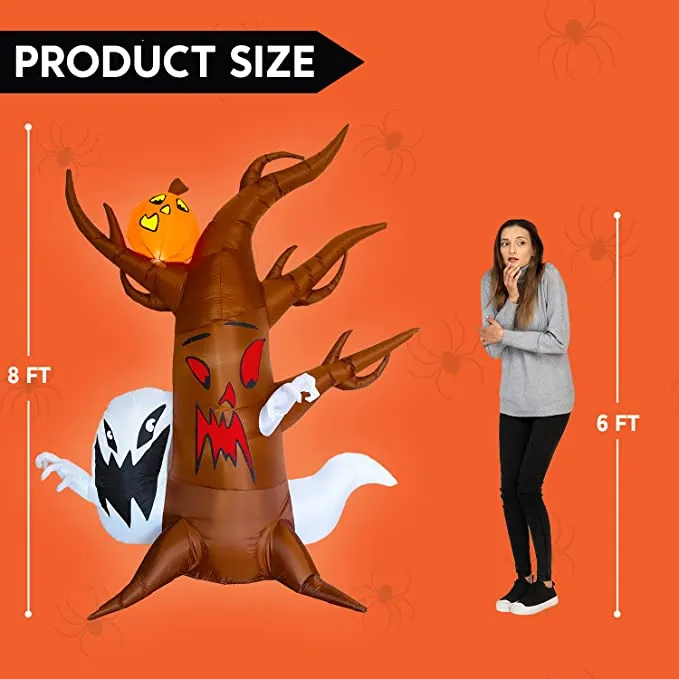 - 8 feet tall scary tree with a ghost through inflatable comes with extended cords, ground stakes, fastened ropes, built-in sandbags, and a plug with ul certification.