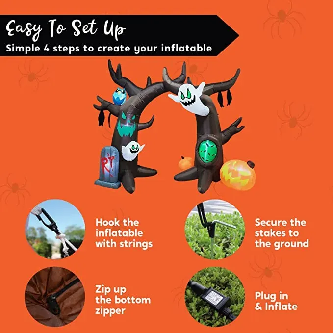 • Inflatable Halloween Tree Decorations features ghosts, tombstone, pumpkins, and more. It comes with an extended cord, ground stakes, fastened ropes, built-in sandbags, and a plug with UL certification.