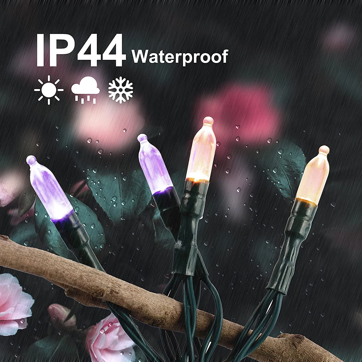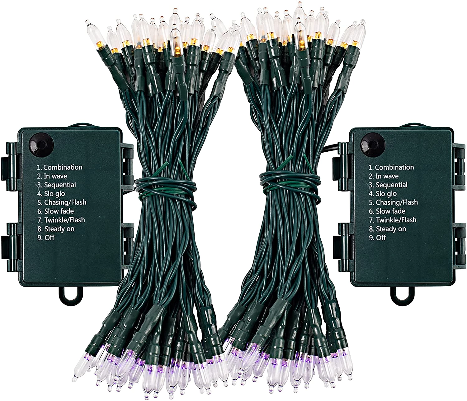 - This Halloween lights set includes 2 packs of battery-powered string lights. Each set has 50 counts of Orange and Purple LED bulbs and measures 17.3ft. The bulbs interval is at 4 inches and its individual size is 3mm*16mm.