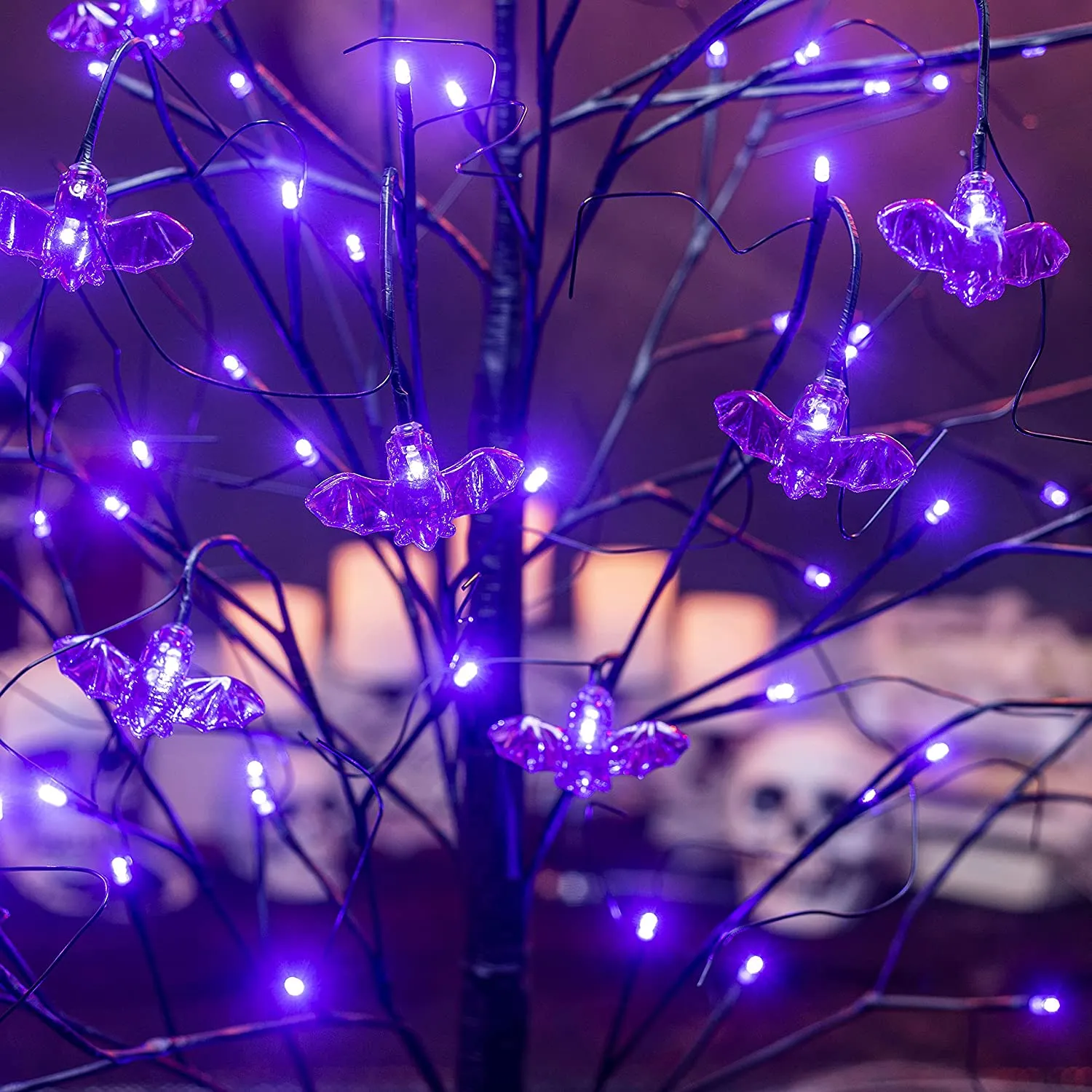 - UNIQUE DESIGN. This Halloween tree decor is uniquely designed with glittered purple LED lights and Halloween themed bat lights on twigs. The Halloween tree’s energy-saving LED lights cast a stunning glow and create a Halloween holiday atmosphere by generating a sparkling lighting effect.
