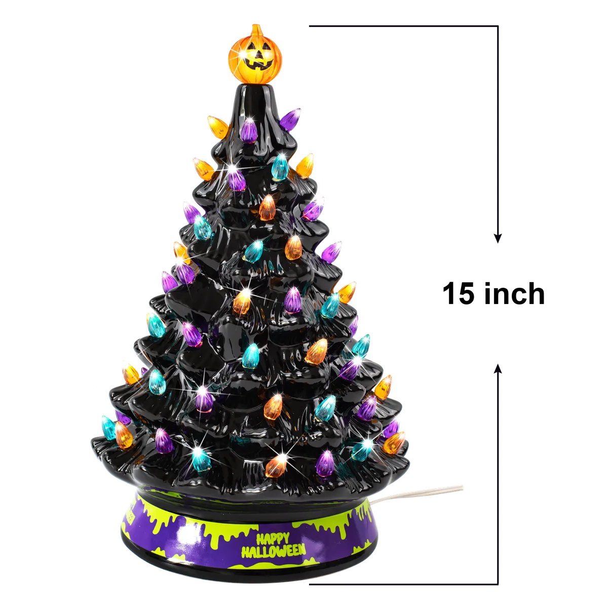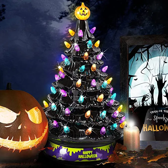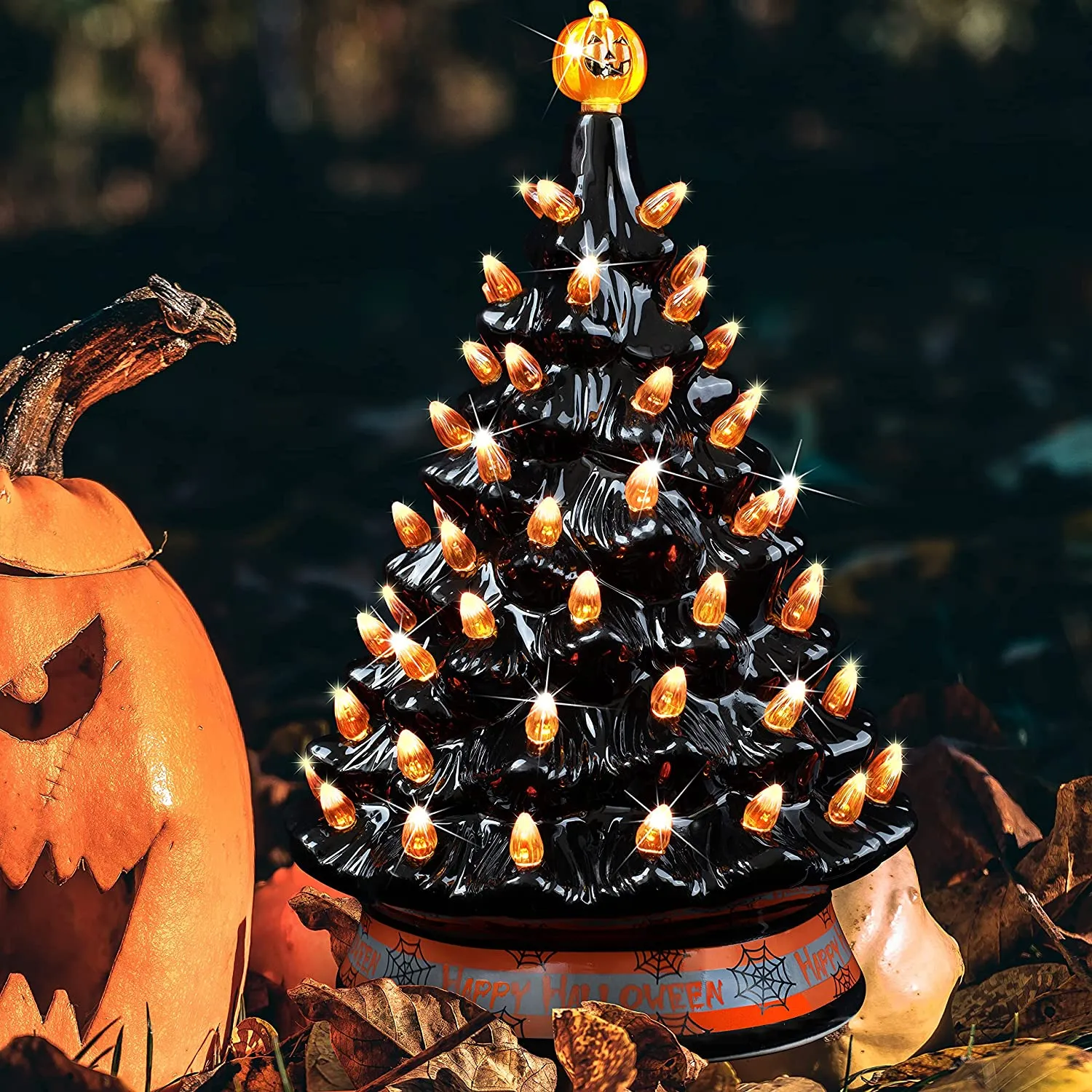 - Our Halloween decor includes 15 inches of Halloween ceramic tree decoration with a purple/orange pre-lit design and a pumpkin head topper with decorative beads this is made from selected ceramic material. It has a bottom-firing print and it’s not easy to fall off.