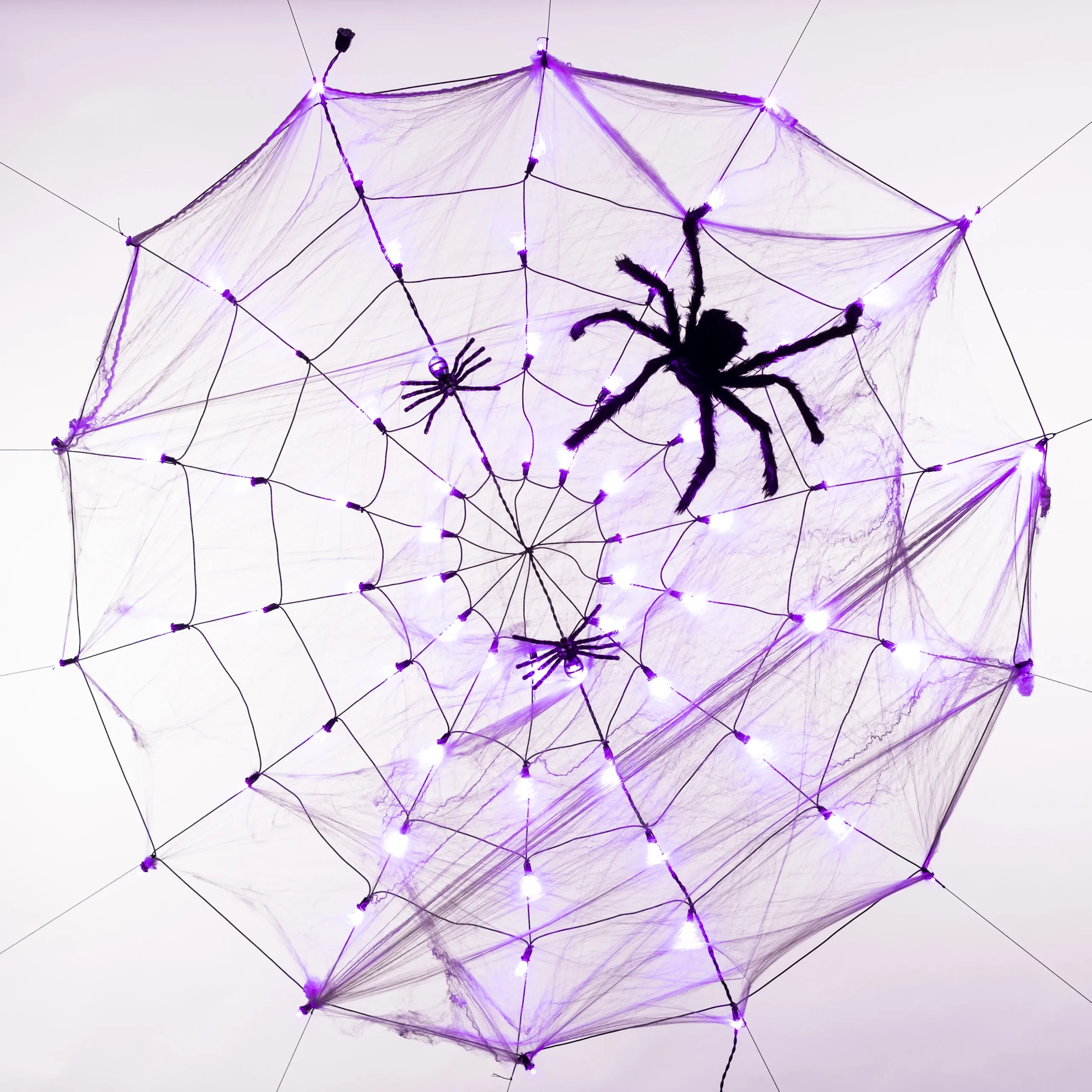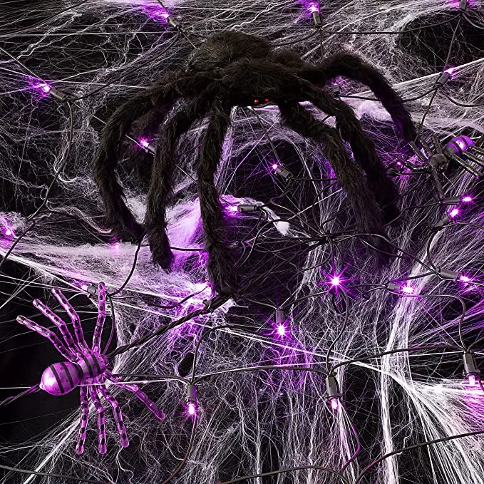 - 59 inches purple spider web, and 2 different size fake spiders! Attract and spook your neighbors!