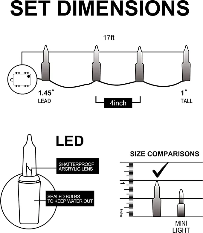 - Our string lights set includes 50 counts of Orange & Purple LED green wire string lights with 8 lighting modes. Each set is 17.3 feet long and has 50 counts of Orange & Purple LEDs with 4 inches spacing in between each bulb. The bulb’s size is 3 mm x 16 mm. These lights are battery powered, operated by remote control with a 6-hour timer.