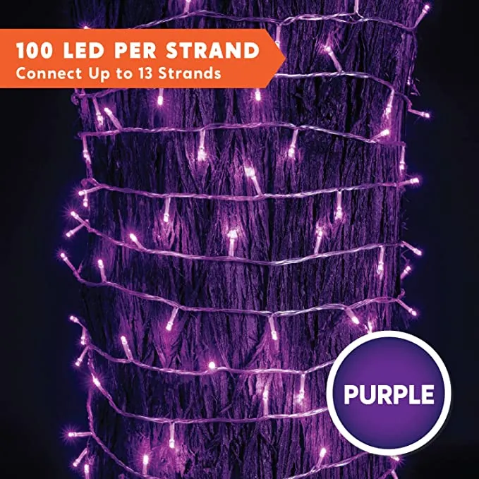 - Our Halloween Lights include 100 purple LED Clear Wire String Lights with 8 Modes. Each set’s total length is 42.9 feet and 100 count purple LED has 3.93 inches spacing. The bulb’s diameter is 5mm and height is 8mm.