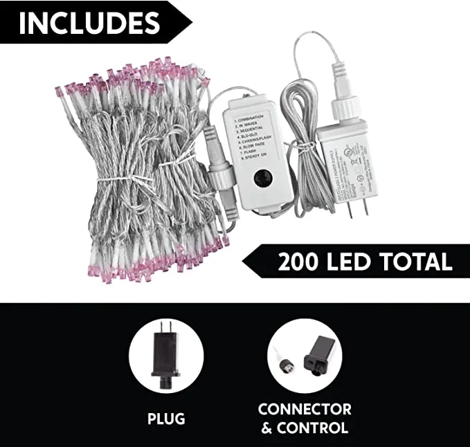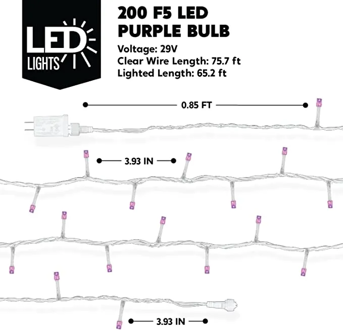 - Our Halloween Lights include 200 Purple LED Clear Wire String Lights with 8 Modes. Each set’s total length is 75.7 feet and 200 counts Purple LED has 3.93 inches spacing. The bulb’s diameter is 5mm and height is 8mm.