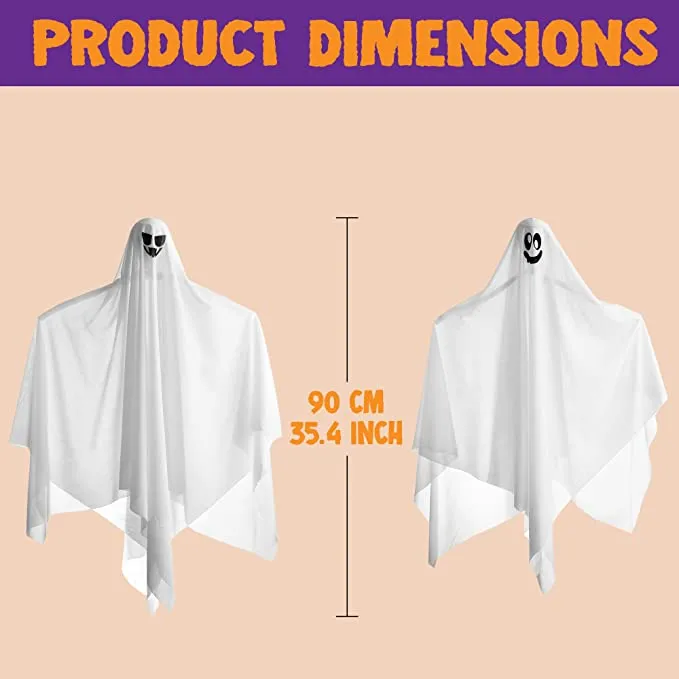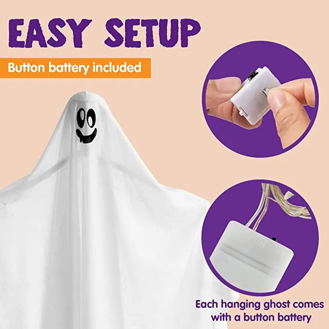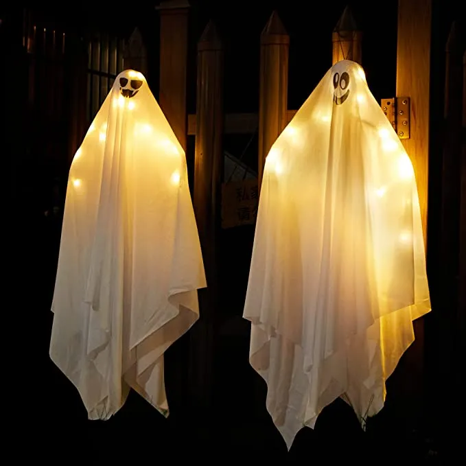 - SUPER VALUE PACK. These 2 pieces 34.5 inches light up hanging ghosts are perfect for any Halloween party or event! This Halloween prop featured with creepy white light, looks like it’s ready to scare your guests, friends and trick-or-treaters. Each ghost comes with a button battery.