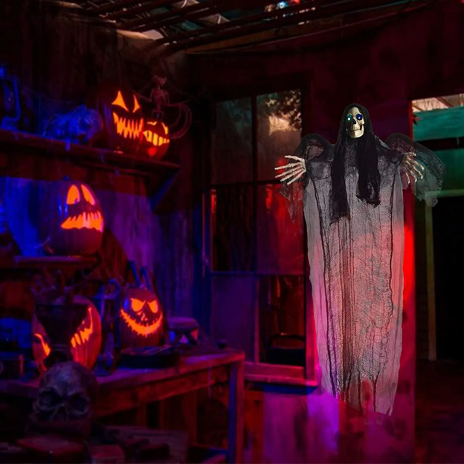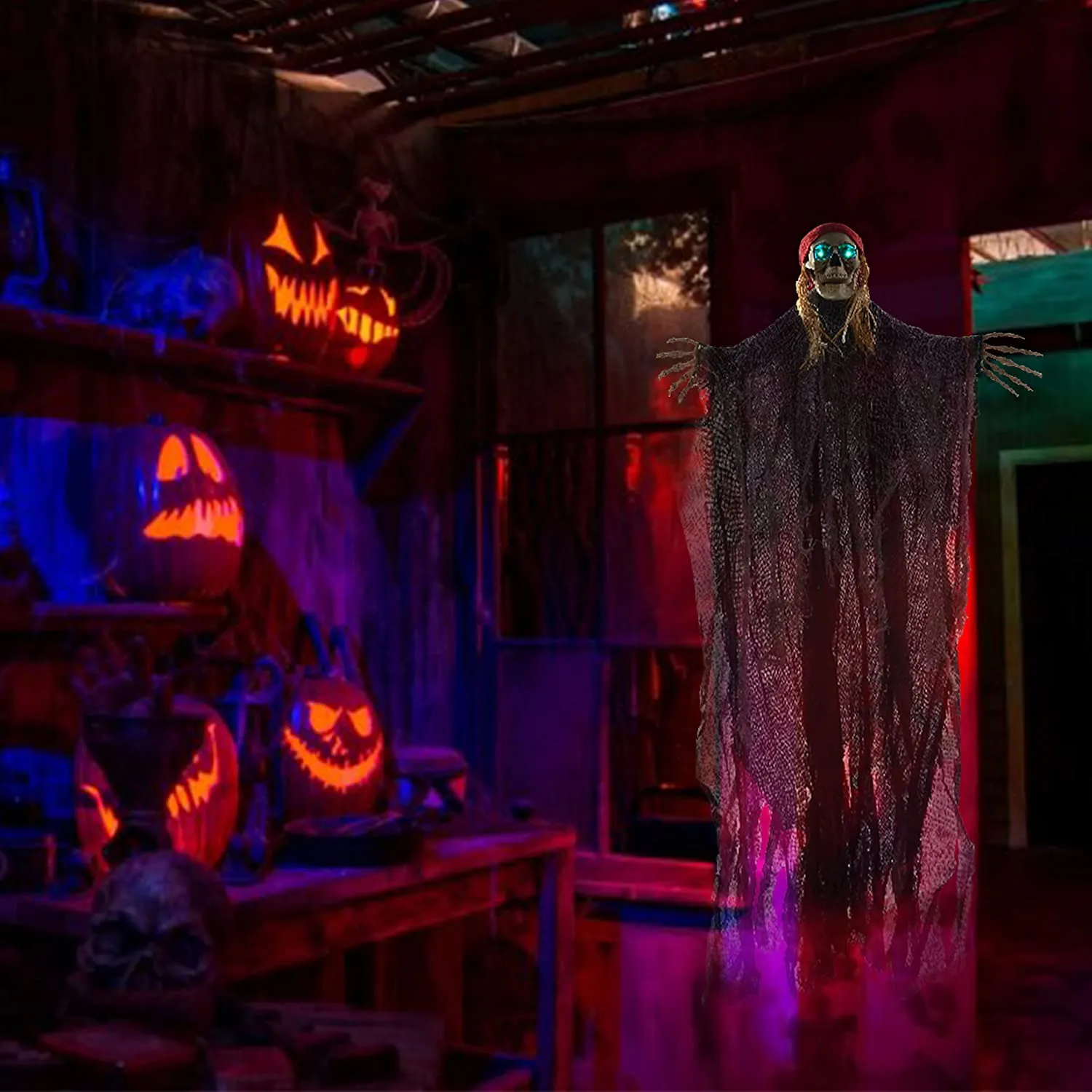 The flying grim reaper and skeleton pirate can be best viewed at night with their eyes that flash as if evoking a dangerous atmosphere in your Halloween party. Our life size Halloween skeleton also has robes that are dark and ragged adding to the overall terrifying look. Once it gets swayed by the breeze, it creates a really frightful Halloween ambiance. It makes an excellent Halloween decoration for haunted houses, graveyards, and wrecked ship-themed Halloween parties.