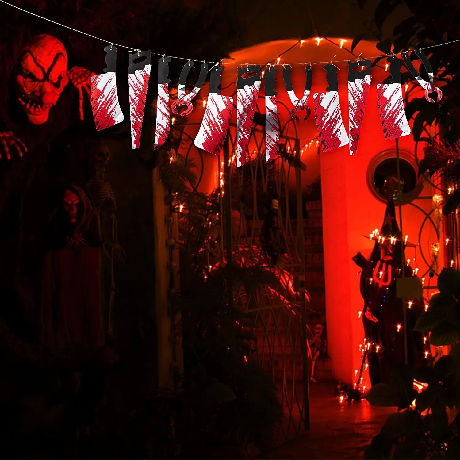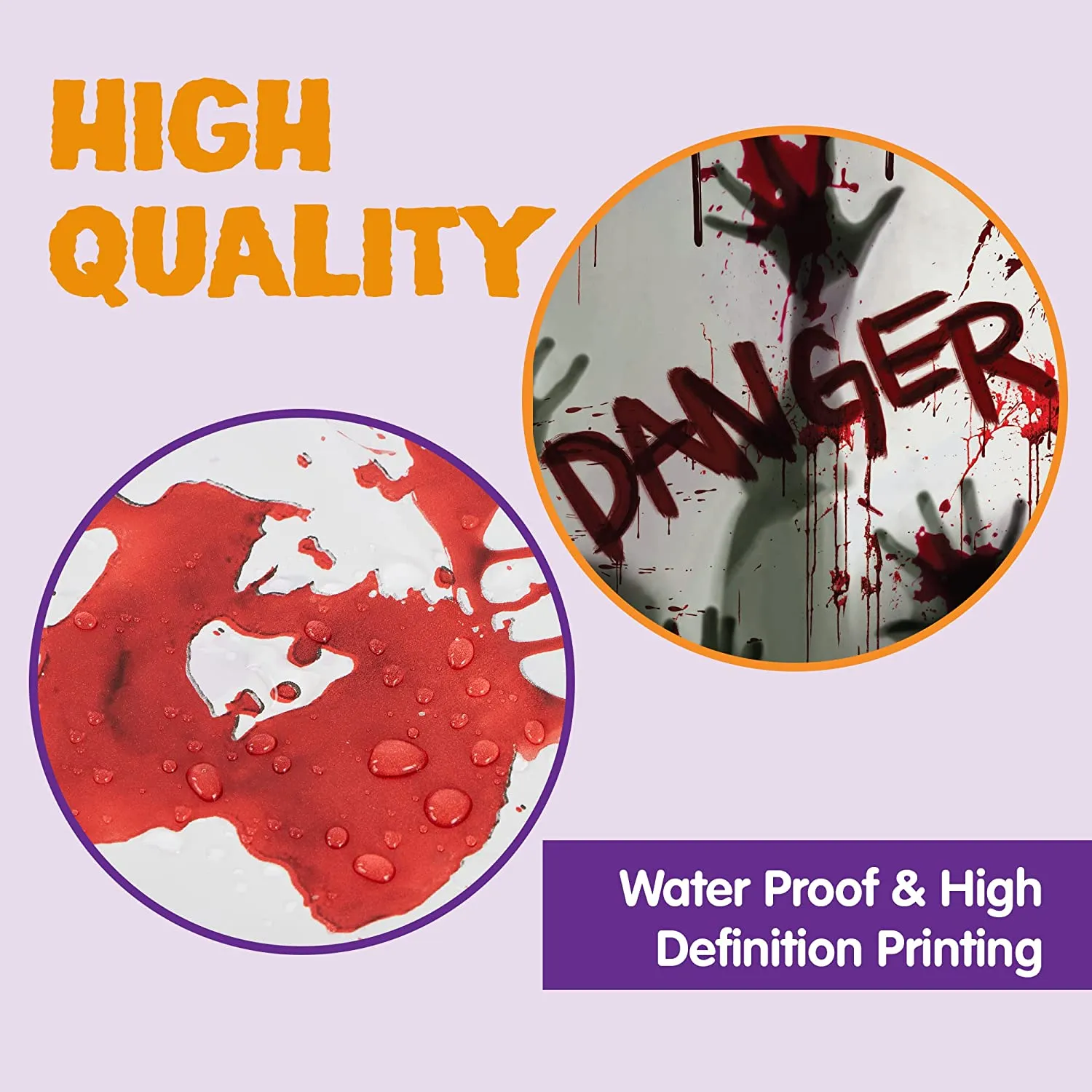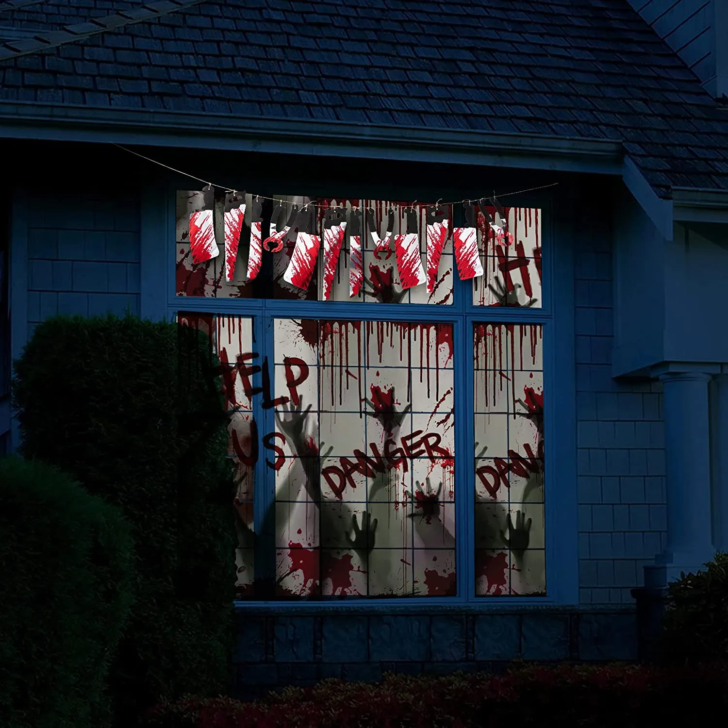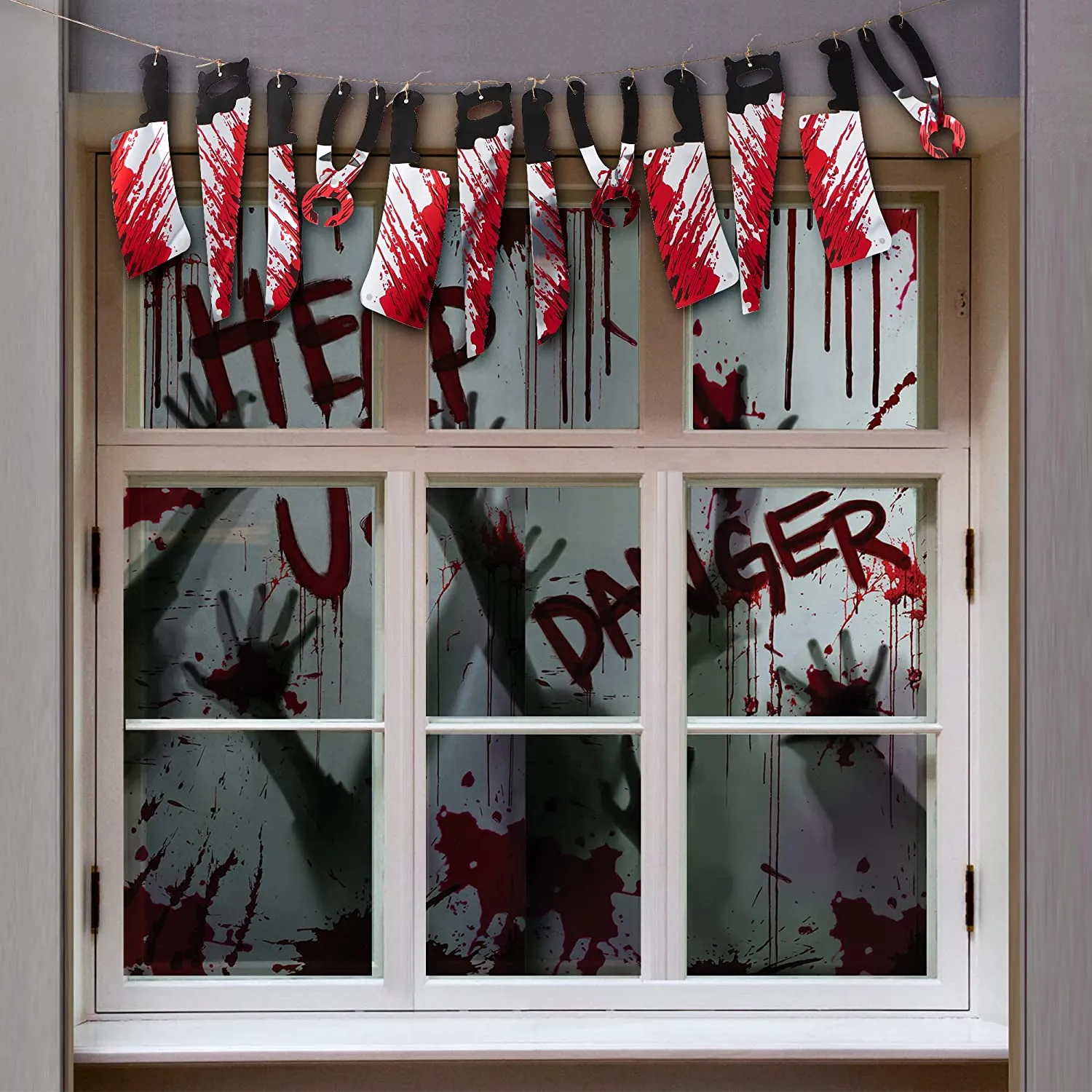 - PREMIUM QUALITY. You can create horror scenes in many places, such as bathrooms, kitchens, windows, and doorways, with our window covers that seem to be a butchering site ,and an official crime scene, a ceiling, a zombie party or a haunted house. Super increases the horror atmosphere of Halloween.