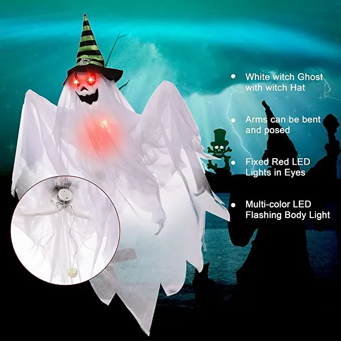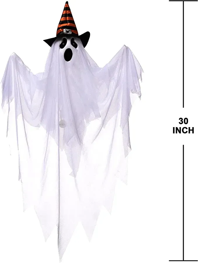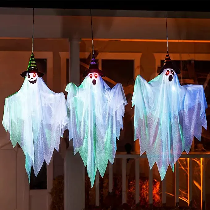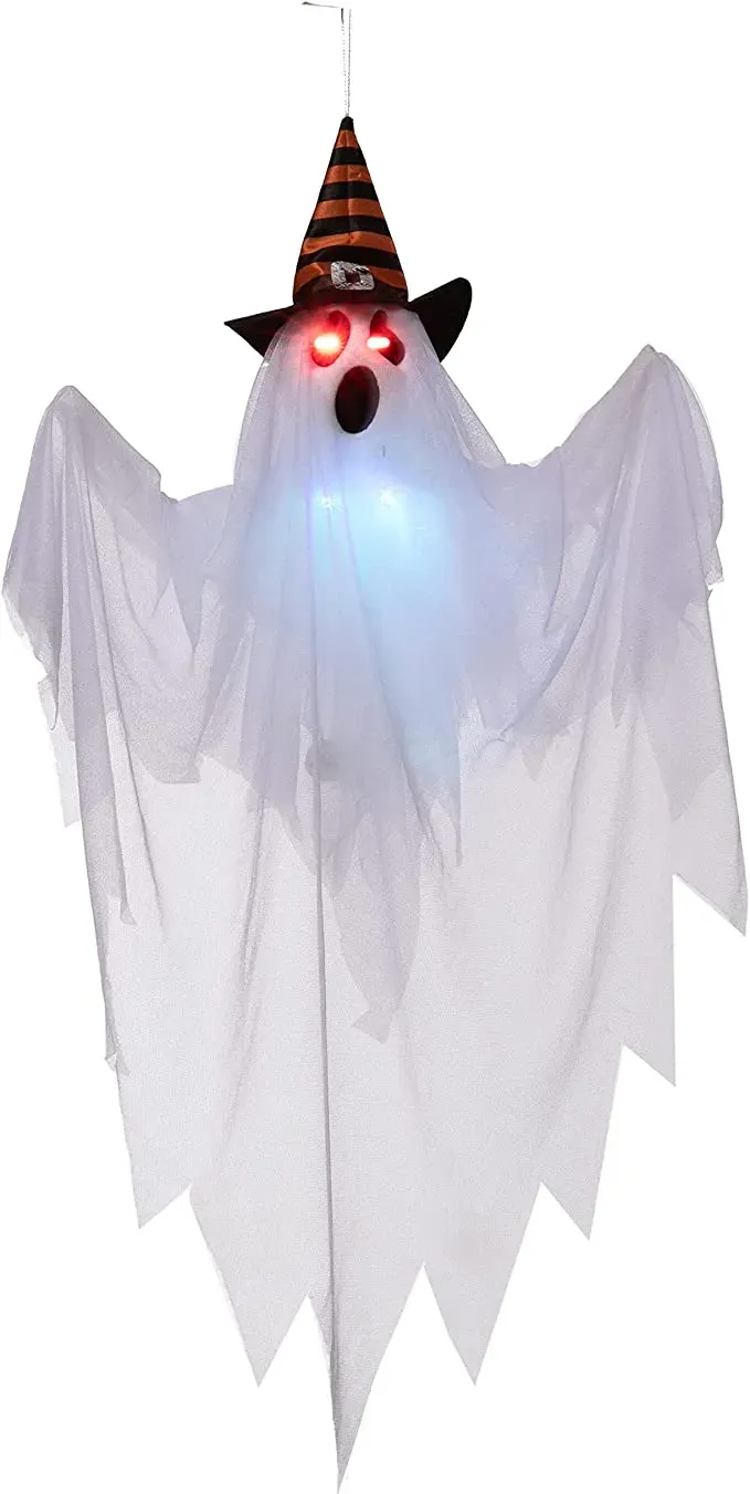 - Our 3 pieces of light-up hanging white ghosts with multi-colored witch hats measure 29.5 inches high.
