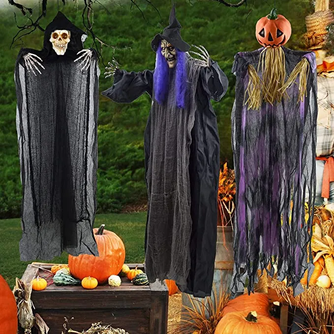 - Our Halloween decor set includes 3 packs of the creepy hanging witch, grim reaper, and pumpkin.