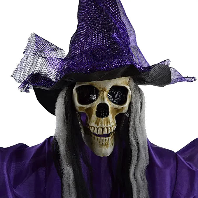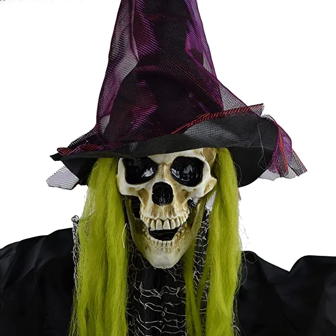 - The jittering skeleton mouth makes it look creepier. With the classic black witch attire, this Halloween prop looks more realistic