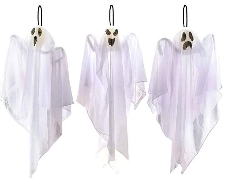 • 3 different traditional ghost faces patterns add variety and our cute Halloween hanging decorations will add more fun to your Halloween. The hanging ghost is made of a white durable fabric cloth over a Styrofoam ball head and flexible Styrofoam stick arms, with a sturdy string to hang it up easily, lightweight, and blow well in the wind.
