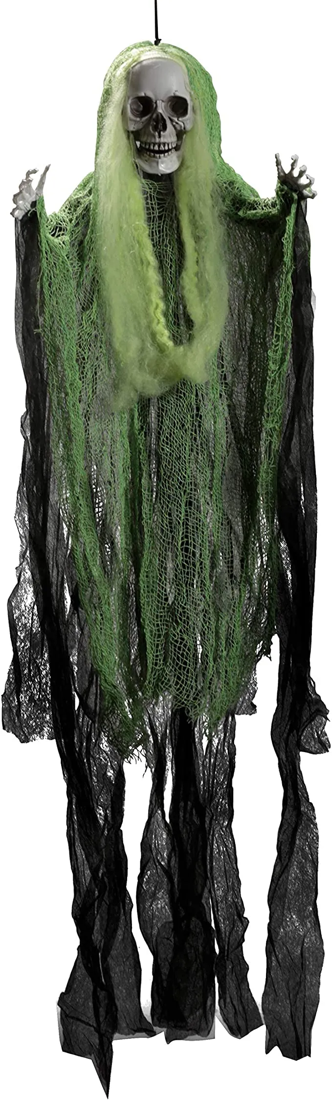 Around Halloween, these eerie grim reaper decorations will make wonderful interior accents. The frightening details are all about the various colored clothing and hair. Any front porch would be under an enormous shadow from its length, which measures 35.3 inches from the skull to the flapping fabric ends. Black material that is ripped at the ends covers most of the figure. It’s frightening enough that two bony hands are prepared to snag any onlookers!