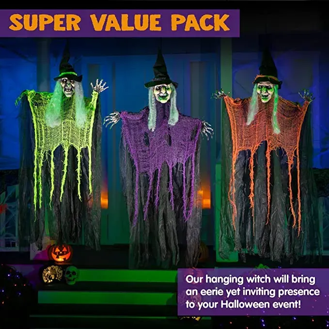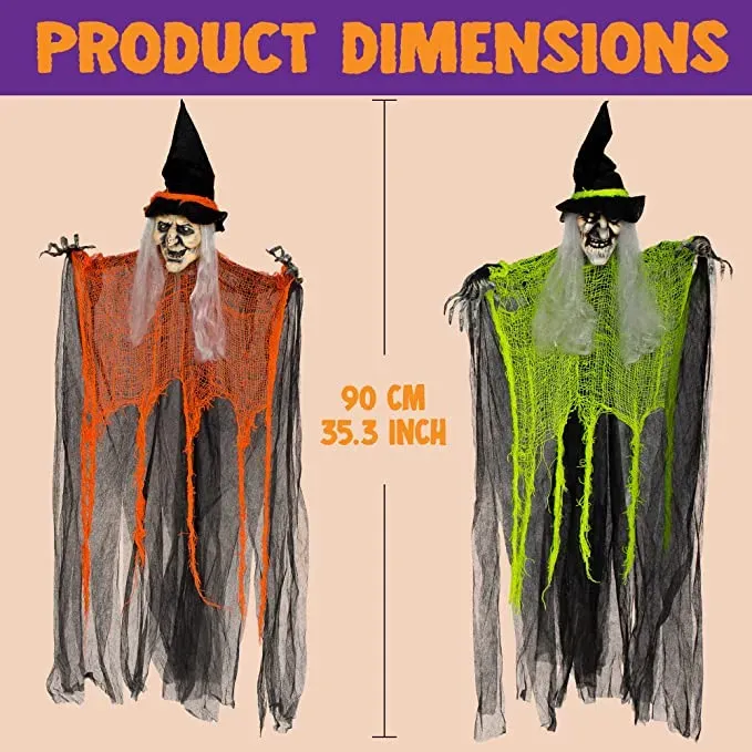 • Hanging Witch Halloween Decorations comes with a set of 3 scary witches that measures 35.3 inches/90cm tall with flowing cloaks of 3 different colors (Green, Red & Purple) to help you create a creepy and scary atmosphere for any Halloween events