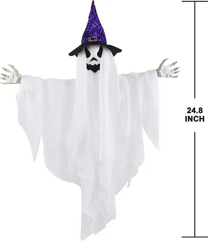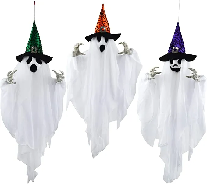 - Our 3 pack of 24.8″ Halloween hanging ghosts in different scary faces with green, purple, and orange hats. Their arms can be bent and posed.