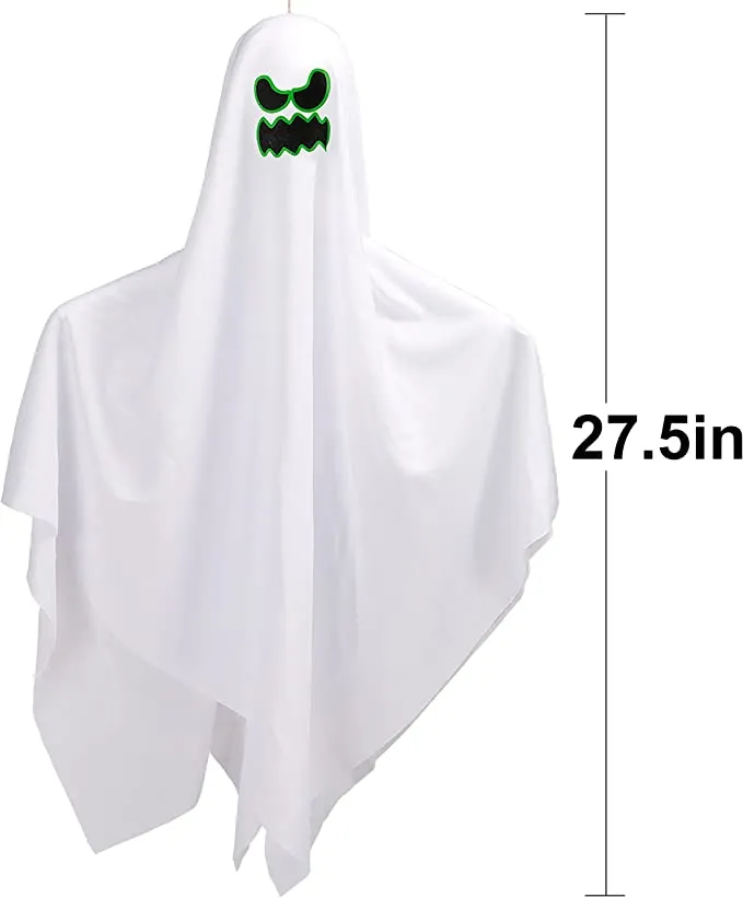 - Our Halloween front porch deor includes 4 pack Halloween glow-in-the-dark hanging ghosts with 4 different scary face expressions in black. These hanging ghosts have creepy faces. Their arms can be bent to achieve your desired pose for each of them.