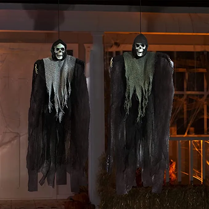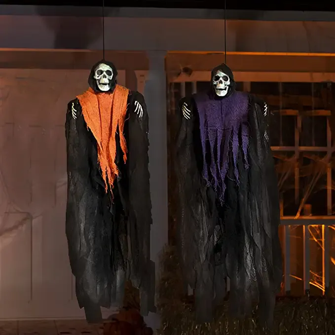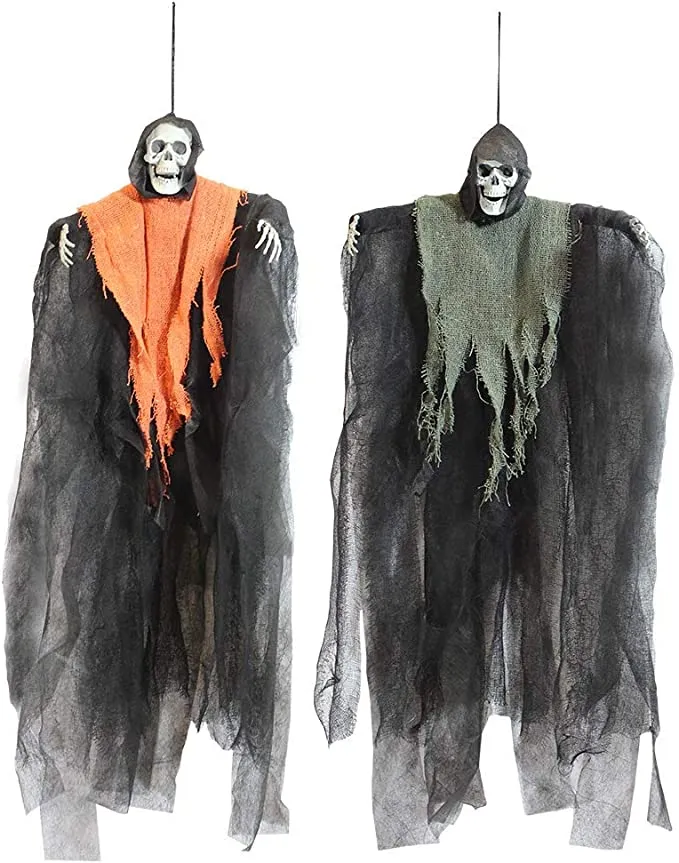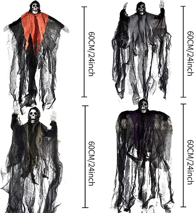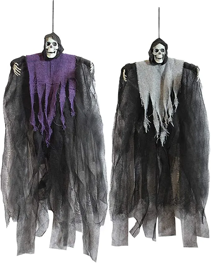 - Our set of 4 scary skeleton hanging grim reapers with flowing cloaks in the color orange, purple, dark grey & light grey. Each measures about 24 inches/60cm tall