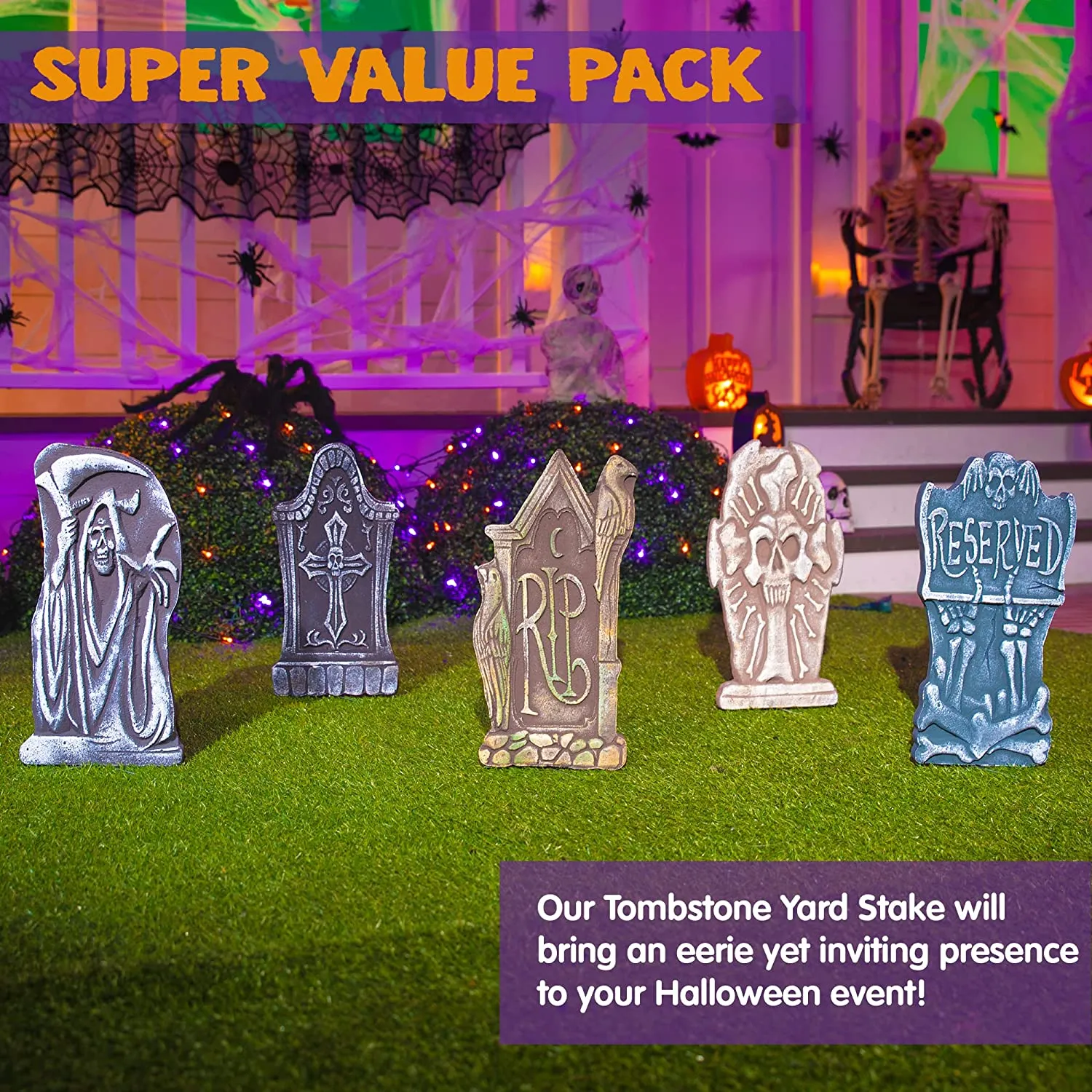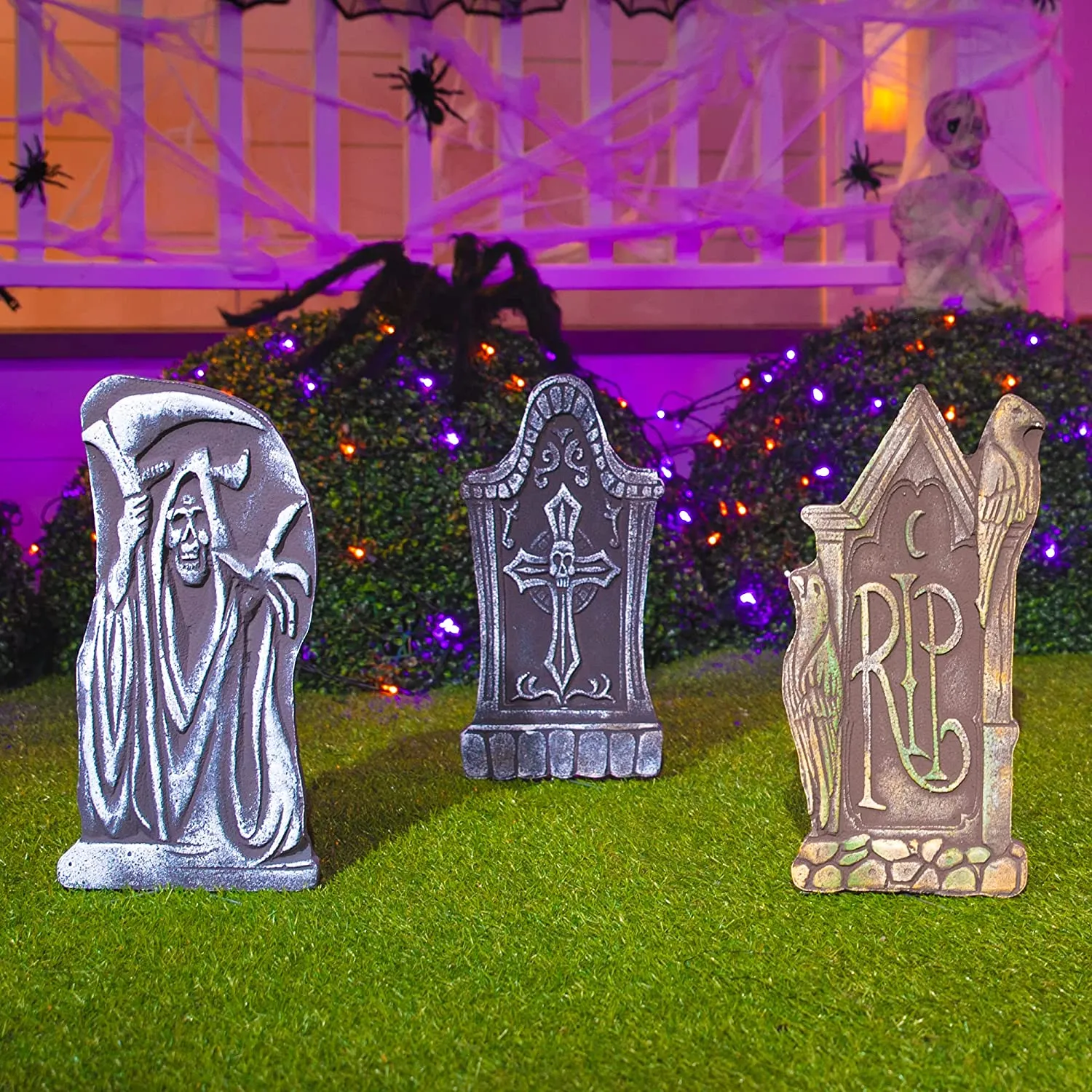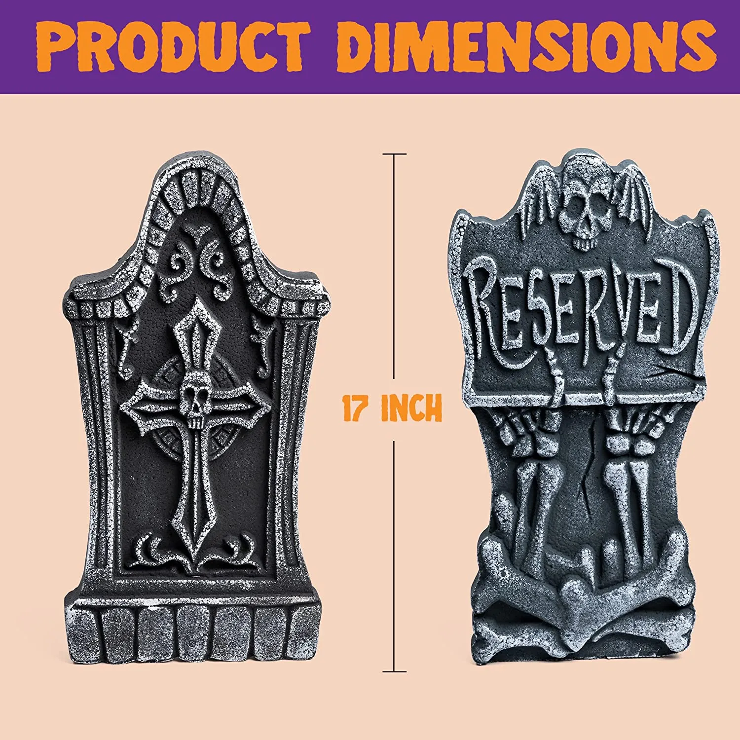 - AWESOME HALLOWEEN DECOR. Our Gravestone Decorations Halloween includes Five 17″ Foam Graveyard Headstones and 12 Metal Stakes for securing the gravestones into the ground for outdoor use
