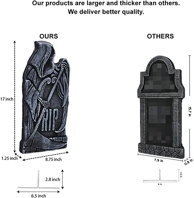 • Joyfy Halloween Tombstones Set is more sturdy, thicker, and bigger than any other brand. Metal Stakes can Secure them better than any other plastic stakes