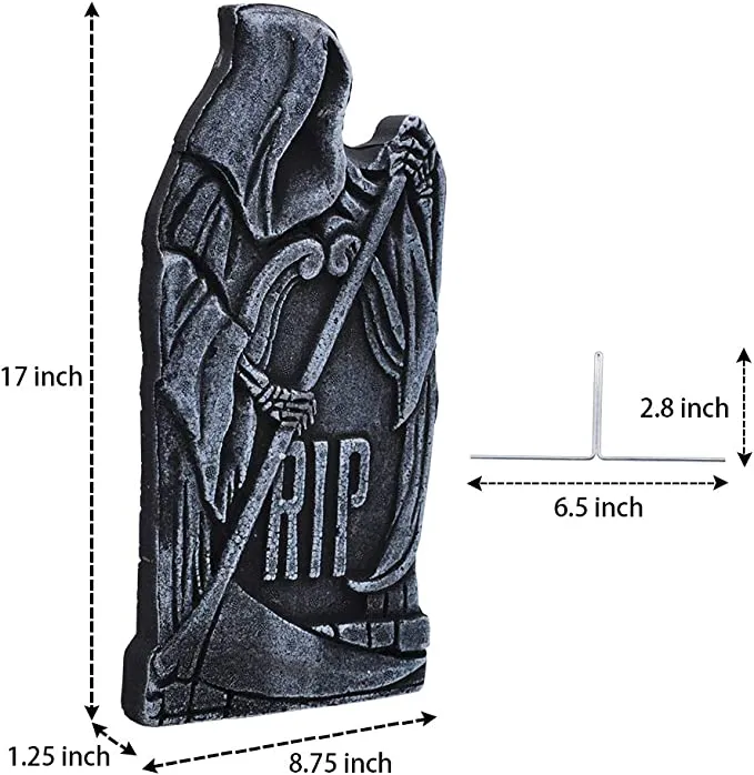 • Graveyard Tombstone Decorations Includes: Five 17″ Foam Graveyard Headstones and 12 Metal Stakes for securing the gravestones into the ground for outdoor use