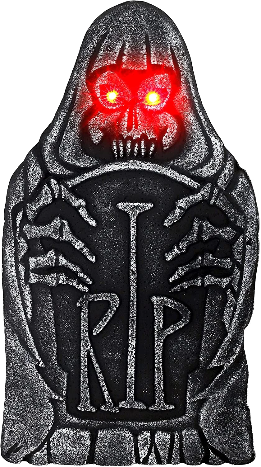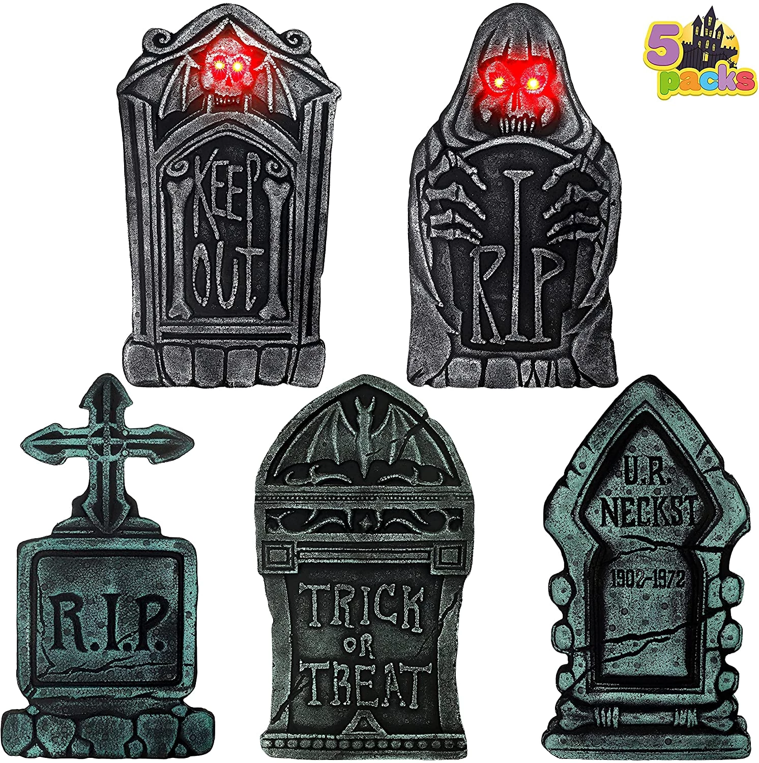 - Our Halloween yard decoration includes 5 pack of creepy tombstone decorations (2 with led lights). Great Halloween yard sign with different and vivid spooky designs and color. The tombstones measure 16″.