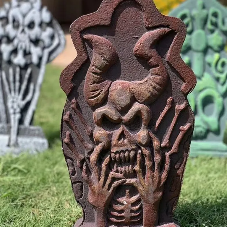 - Our Halloween lightweight tombstones give your yard a deadly appearance, create a creepy and scary atmosphere for any Halloween events, it includes – five 17″ foam graveyard headstones and 12 metal stakes for securing the gravestones into the ground for outdoor use
