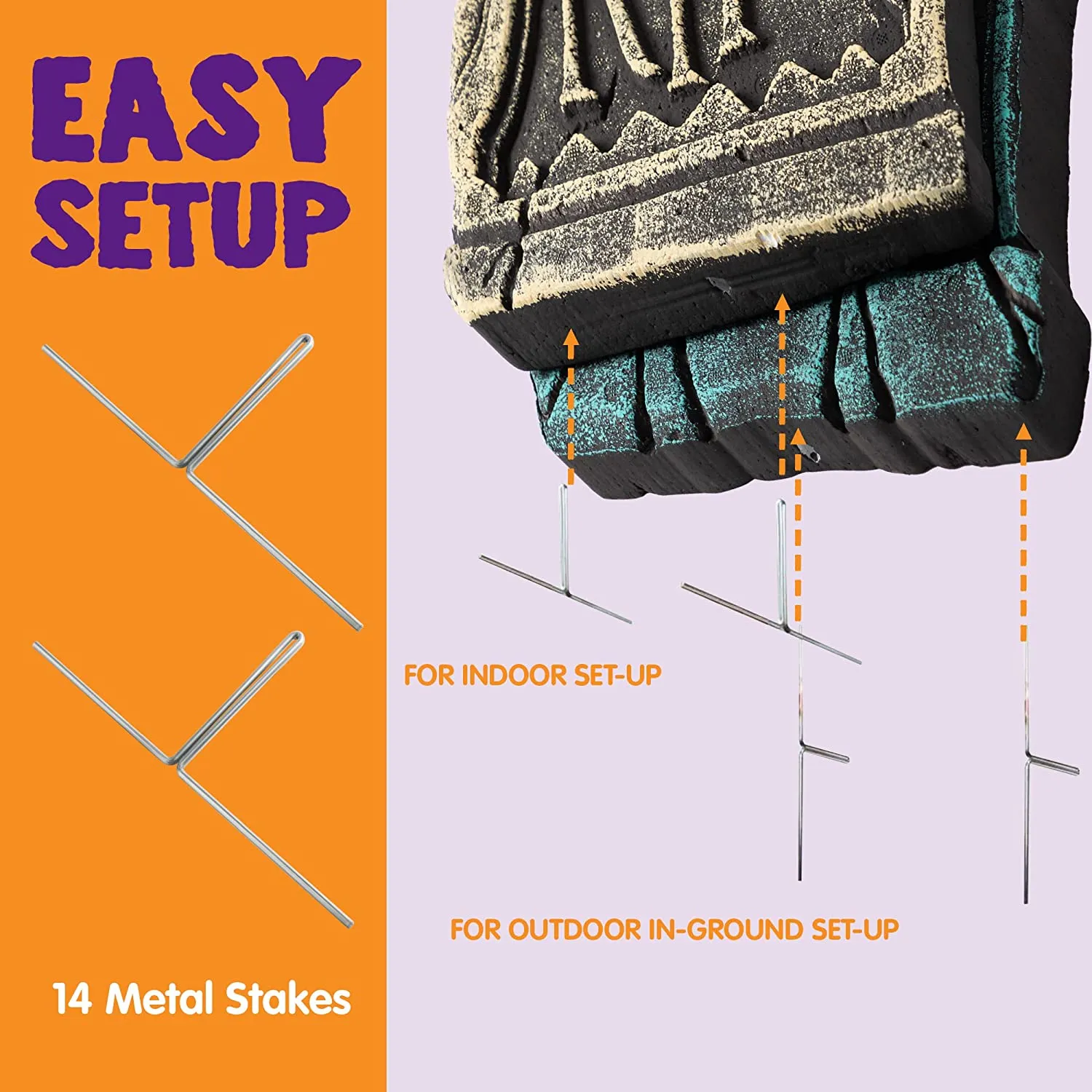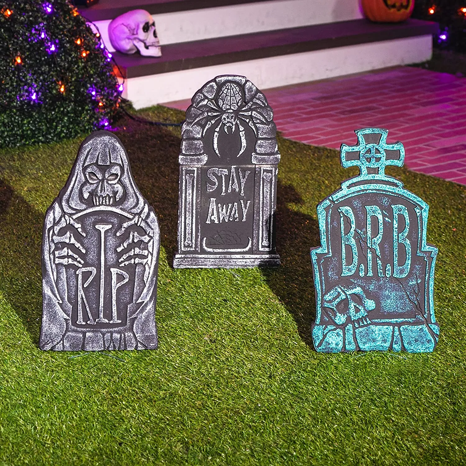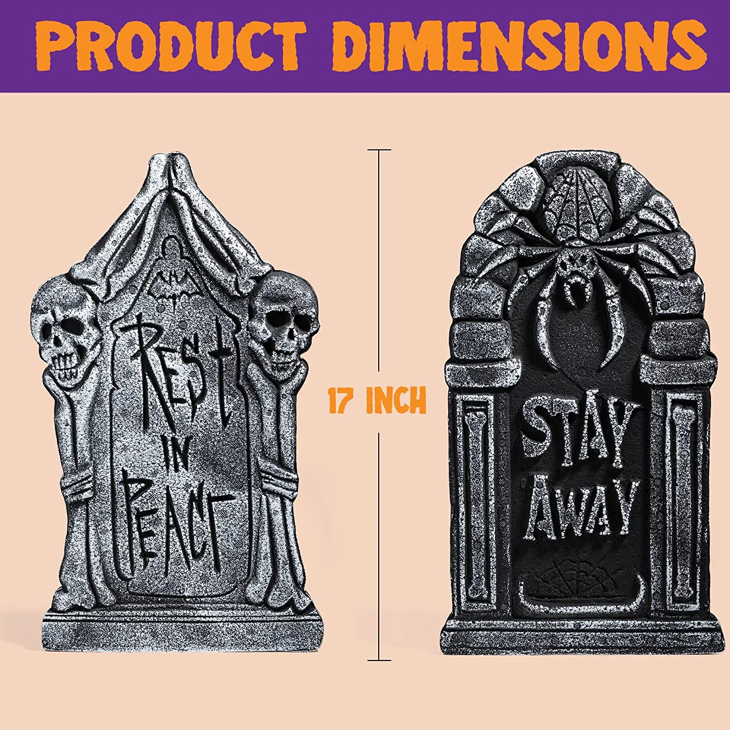 - AWESOME HALLOWEEN DECOR. Use these foam Halloween tombstone decorations, which are lightweight and portable, to give your yard a deadly aspect.Our outdoor graveyard decorations includes Six 17‘’ Foam Graveyard Headstones and 14 Metal Stakes for securing the gravestones into the ground for outdoor use.
