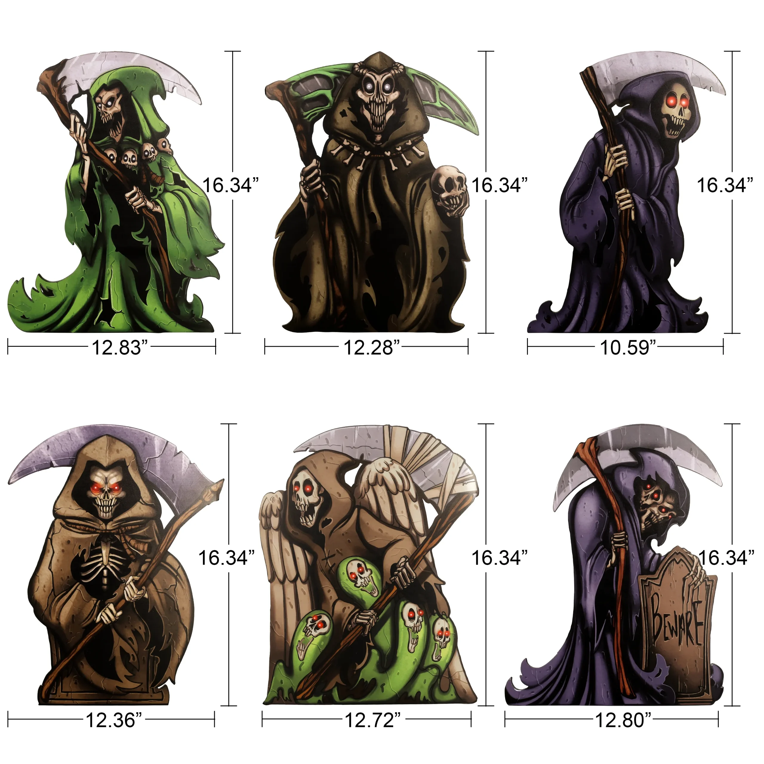 - Our 6 grim reaper yard signs are more sturdy, thicker, and bigger than any other brands. Metal stakes can secure them better than any other plastic stakes. Includes – six 16.34″ PVC grim reaper yard signs and 14 metal stakes(2 are spare) for securing the yard signs into the ground for outdoor use.