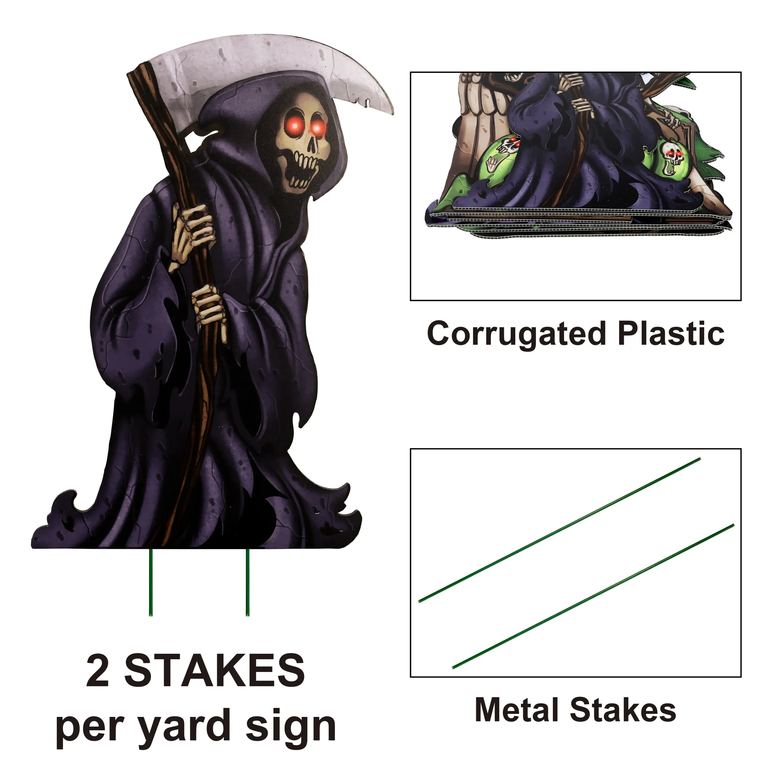 - Our grim reaper yard signs give your yard a deadly appearance, create a creepy and scary atmosphere for any Halloween events, spooky entertainment, haunted houses party and other themes occasions.